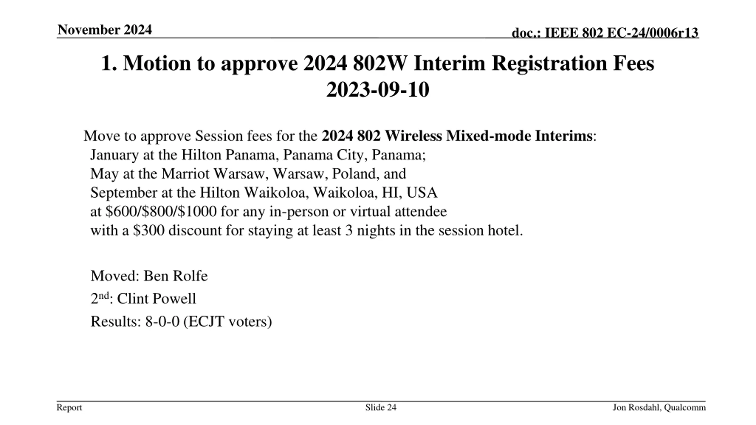November 2024 doc.: IEEE 802 EC-24/0006r13 1. Motion to approve 2024 802W Interim Registration Fees 2023-09-10 Move to approve Session fees for the 2024 802 Wireless Mixed-mode Interims: January at the Hilton Panama, Panama City, Panama; May at the Marriot Warsaw, Warsaw, Poland, and September at the Hilton Waikoloa, Waikoloa, HI, USA at $600/$800/$1000 for any in-person or virtual attendee with a $300 discount for staying at least 3 nights in the session hotel. Moved: Ben Rolfe 2nd: Clint Powell Results: 8-0-0 (ECJT voters) Report Slide 24 Jon Rosdahl, Qualcomm