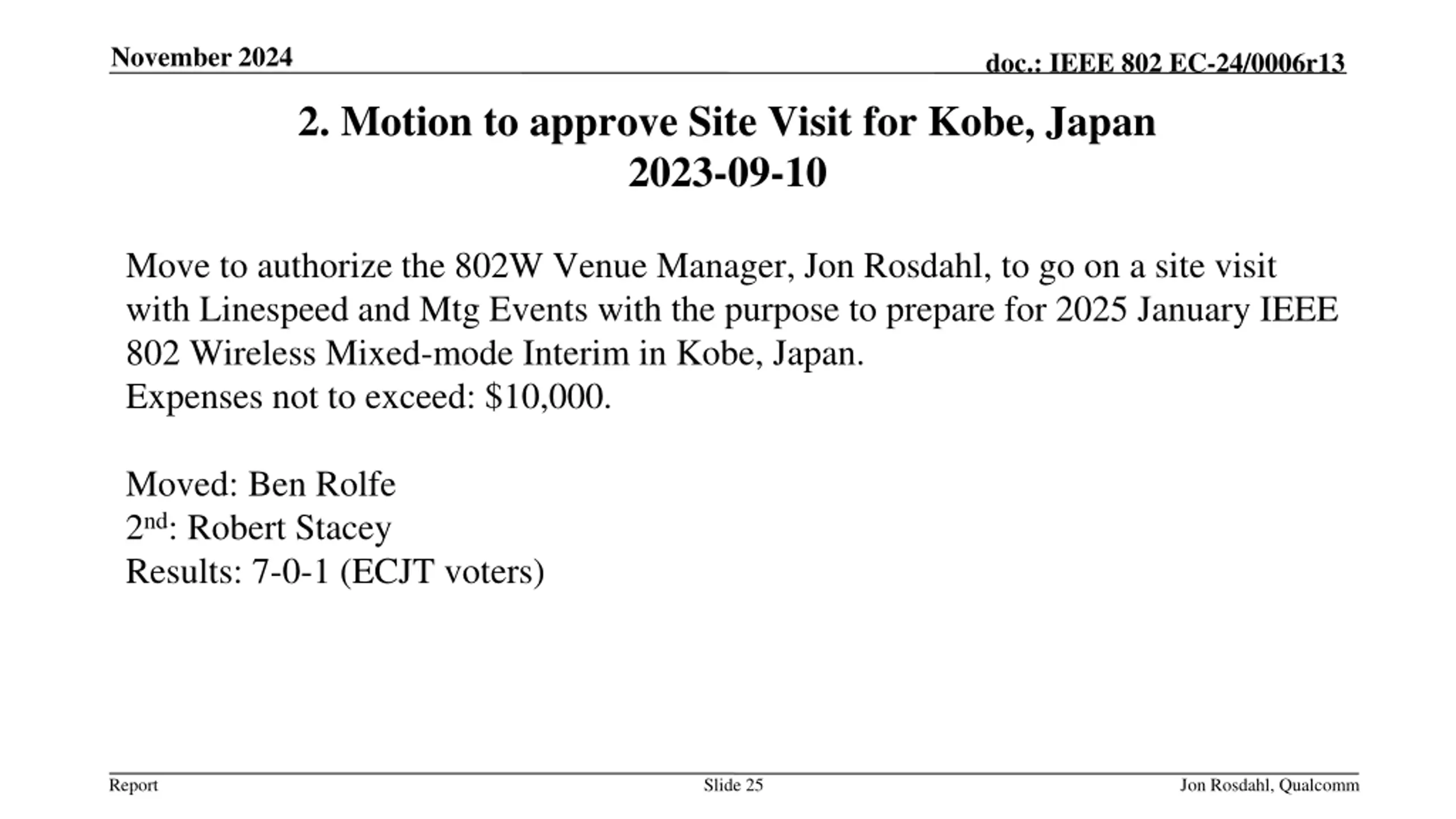 November 2024 doc.: IEEE 802 EC-24/0006r13 2. Motion to approve Site Visit for Kobe, Japan 2023-09-10 Move to authorize the 802W Venue Manager, Jon Rosdahl, to go on a site visit with Linespeed and Mtg Events with the purpose to prepare for 2025 January IEEE 802 Wireless Mixed-mode Interim in Kobe, Japan. Expenses not to exceed: $10,000. Moved: Ben Rolfe 2nd: Robert Stacey Results: 7-0-1 (ECJT voters) Report Slide 25 Jon Rosdahl, Qualcomm