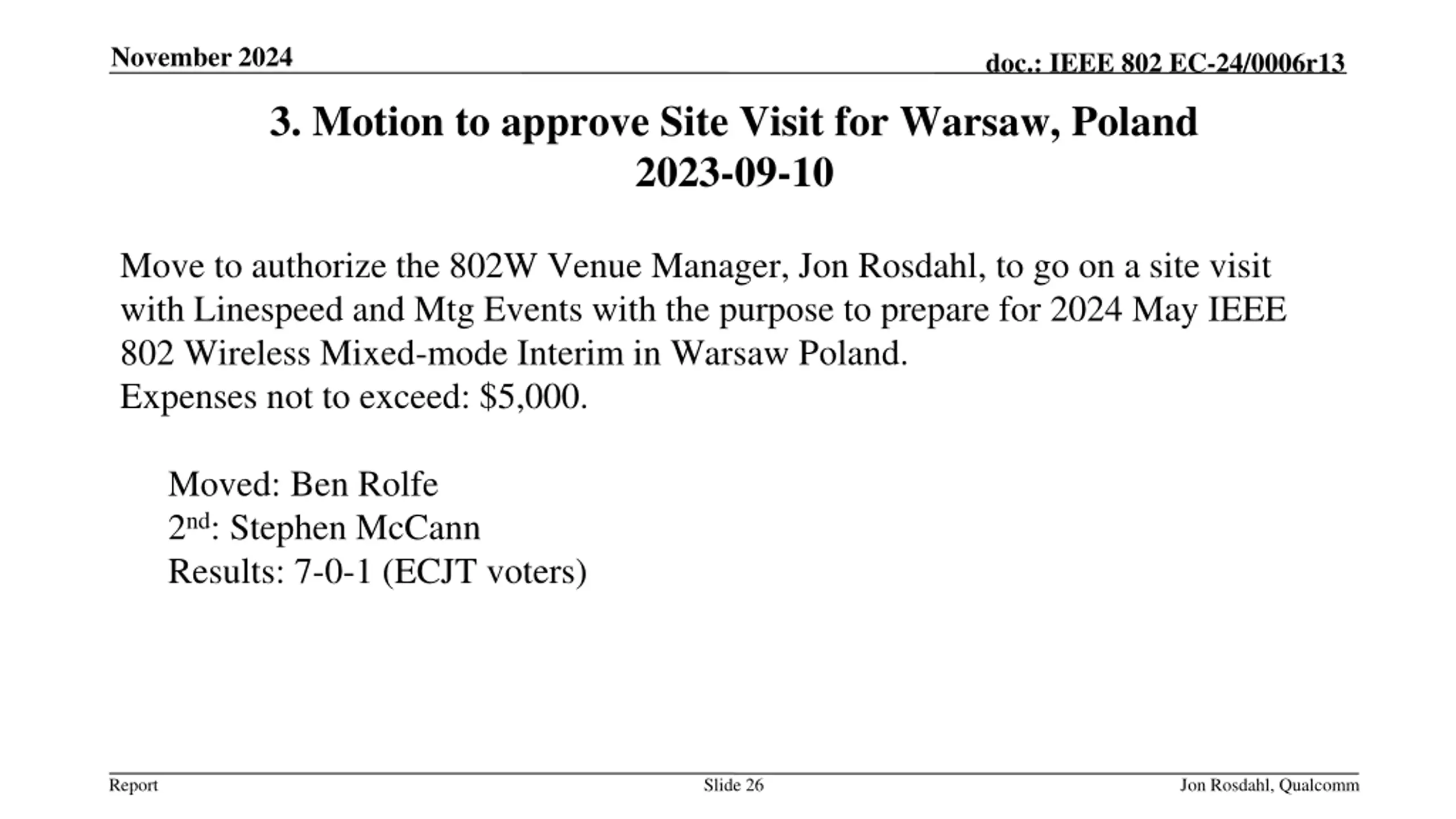 November 2024 doc.: IEEE 802 EC-24/0006r13 3. Motion to approve Site Visit for Warsaw, Poland 2023-09-10 Move to authorize the 802W Venue Manager, Jon Rosdahl, to go on a site visit with Linespeed and Mtg Events with the purpose to prepare for 2024 May IEEE 802 Wireless Mixed-mode Interim in Warsaw Poland. Expenses not to exceed: $5,000. Moved: Ben Rolfe 2nd: Stephen McCann Results: 7-0-1 (ECJT voters) Report Slide 26 Jon Rosdahl, Qualcomm