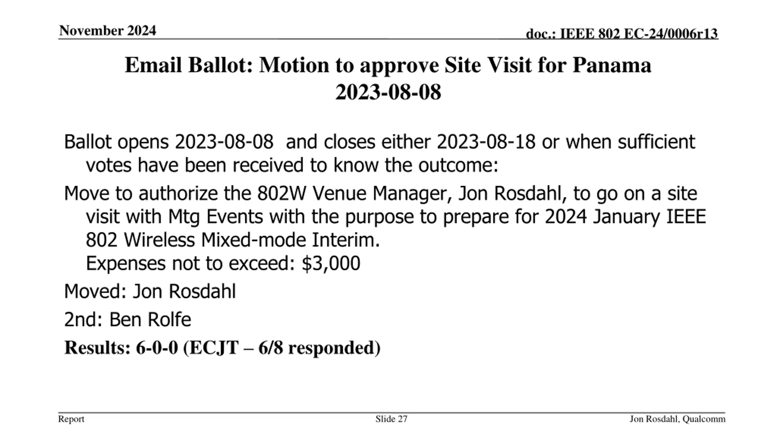 November 2024 doc.: IEEE 802 EC-24/0006r13 Email Ballot: Motion to approve Site Visit for Panama 2023-08-08 Ballot opens 2023-08-08 and closes either 2023-08-18 or when sufficient votes have been received to know the outcome: Move to authorize the 802W Venue Manager, Jon Rosdahl, to go on a site visit with Mtg Events with the purpose to prepare for 2024 January IEEE 802 Wireless Mixed-mode Interim. Expenses not to exceed: $3,000 Moved: Jon Rosdahl 2nd: Ben Rolfe Results: 6-0-0 (ECJT 6/8 responded) Report Slide 27 Jon Rosdahl, Qualcomm