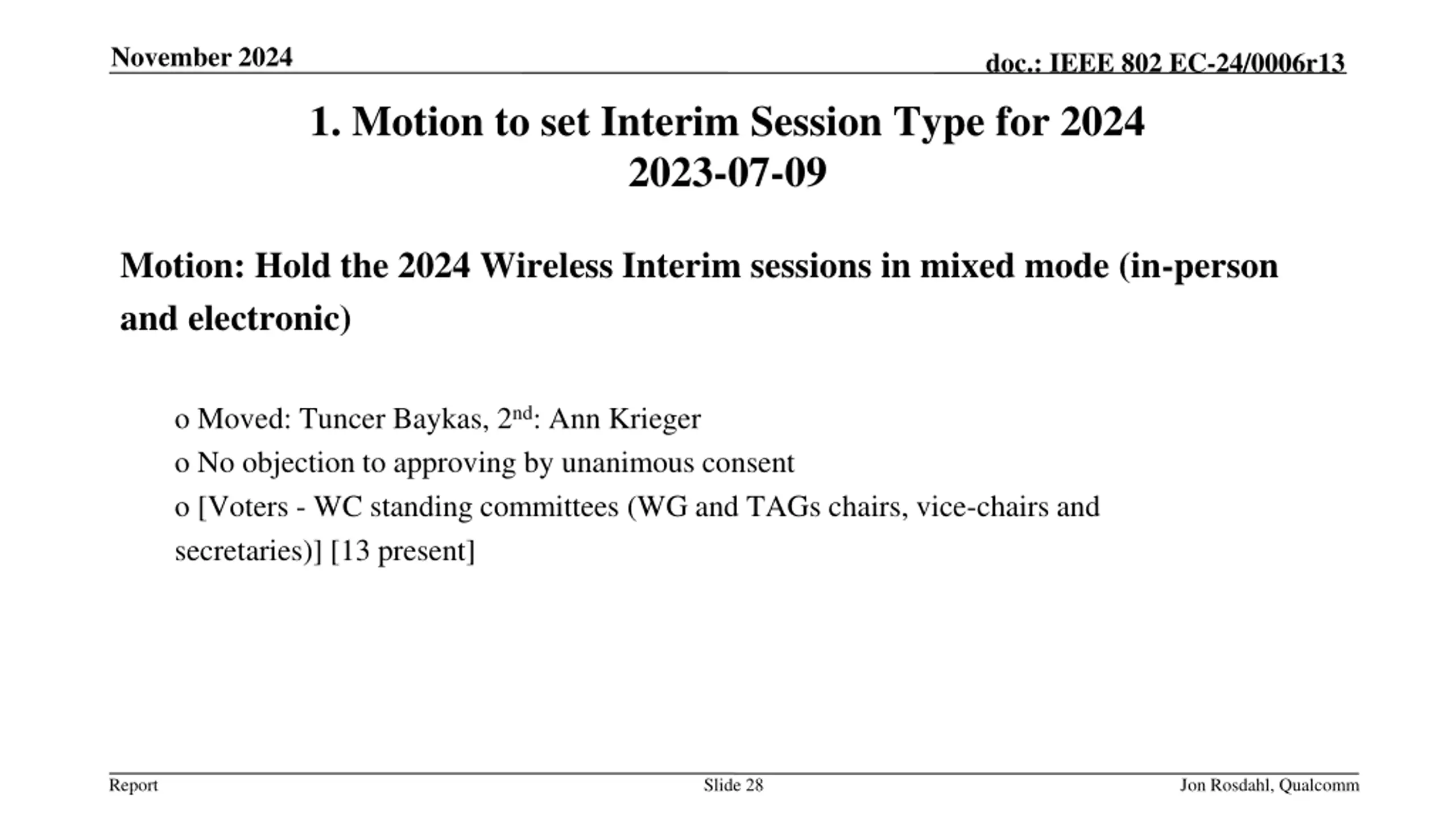 November 2024 doc.: IEEE 802 EC-24/0006r13 1. Motion to set Interim Session Type for 2024 2023-07-09 Motion: Hold the 2024 Wireless Interim sessions in mixed mode (in-person and electronic) o Moved: Tuncer Baykas, 2nd: Ann Krieger o No objection to approving by unanimous consent o [Voters - WC standing committees (WG and TAGs chairs, vice-chairs and secretaries)] [13 present] Report Slide 28 Jon Rosdahl, Qualcomm