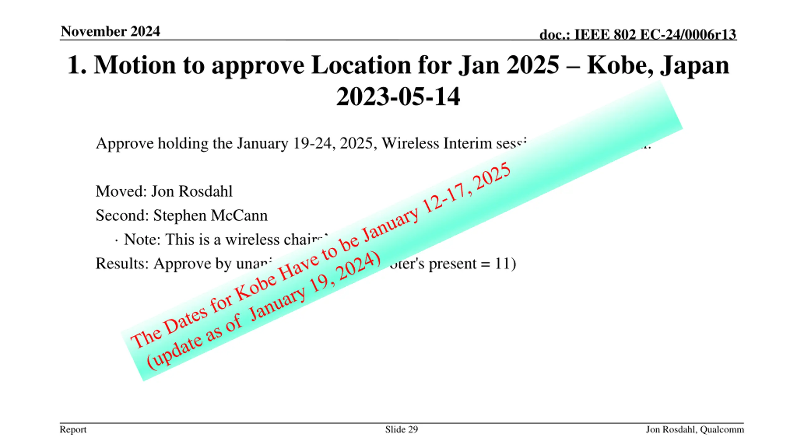 November 2024 doc.: IEEE 802 EC-24/0006r13 1. Motion to approve Location for Jan 2025 Kobe, Japan 2023-05-14 Approve holding the January 19-24, 2025, Wireless Interim session in Kobe, Japan. Moved: Jon Rosdahl Second: Stephen McCann Note: This is a wireless chairs motion. Results: Approve by unanimous consent. (Voter's present = 11) Report Slide 29 Jon Rosdahl, Qualcomm