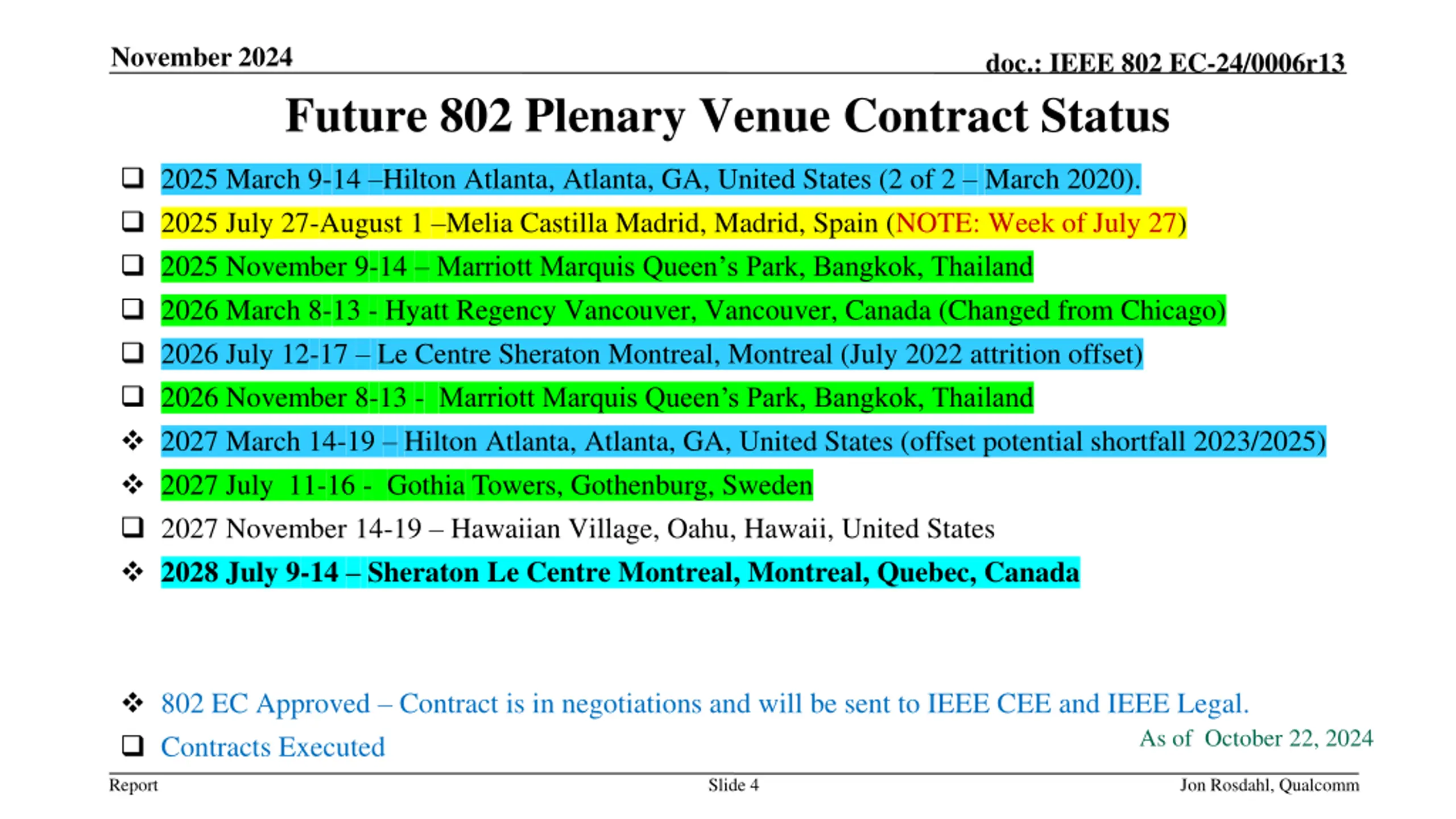November 2024 doc.: IEEE 802 EC-24/0006r13 Future 802 Plenary Venue Contract Status 2025 March 9-14 Hilton Atlanta, Atlanta, GA, United States (2 of 2 March 2020). 2025 July 27-August 1 Melia Castilla Madrid, Madrid, Spain (NOTE: Week of July 27) 2025 November 9-14 Marriott Marquis Queen s Park, Bangkok, Thailand 2026 March 8-13 - Hyatt Regency Vancouver, Vancouver, Canada (Changed from Chicago) 2026 July 12-17 Le Centre Sheraton Montreal, Montreal (July 2022 attrition offset) 2026 November 8-13 - Marriott Marquis Queen s Park, Bangkok, Thailand 2027 March 14-19 Hilton Atlanta, Atlanta, GA, United States (offset potential shortfall 2023/2025) 2027 July 11-16 - Gothia Towers, Gothenburg, Sweden 2027 November 14-19 Hawaiian Village, Oahu, Hawaii, United States 2028 July 9-14 Sheraton Le Centre Montreal, Montreal, Quebec, Canada 802 EC Approved Contract is in negotiations and will be sent to IEEE CEE and IEEE Legal. Contracts Executed As of October 22, 2024 Report Slide 4 Jon Rosdahl, Qualcomm