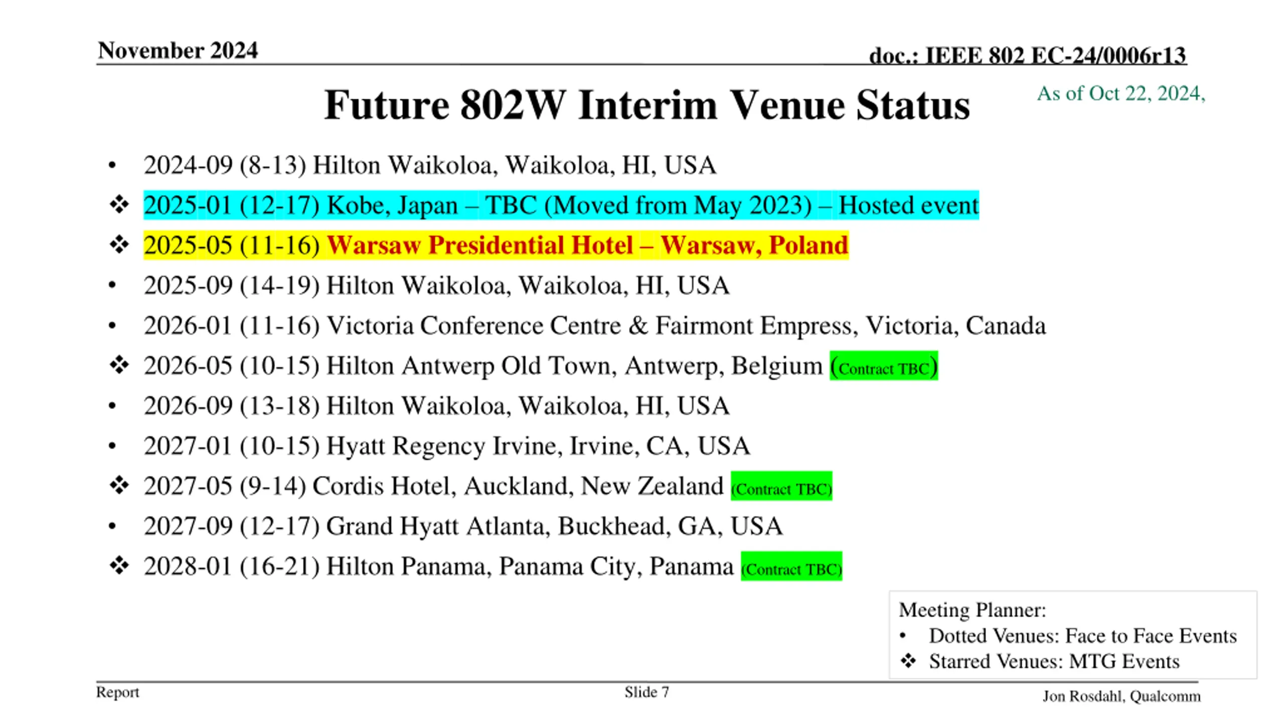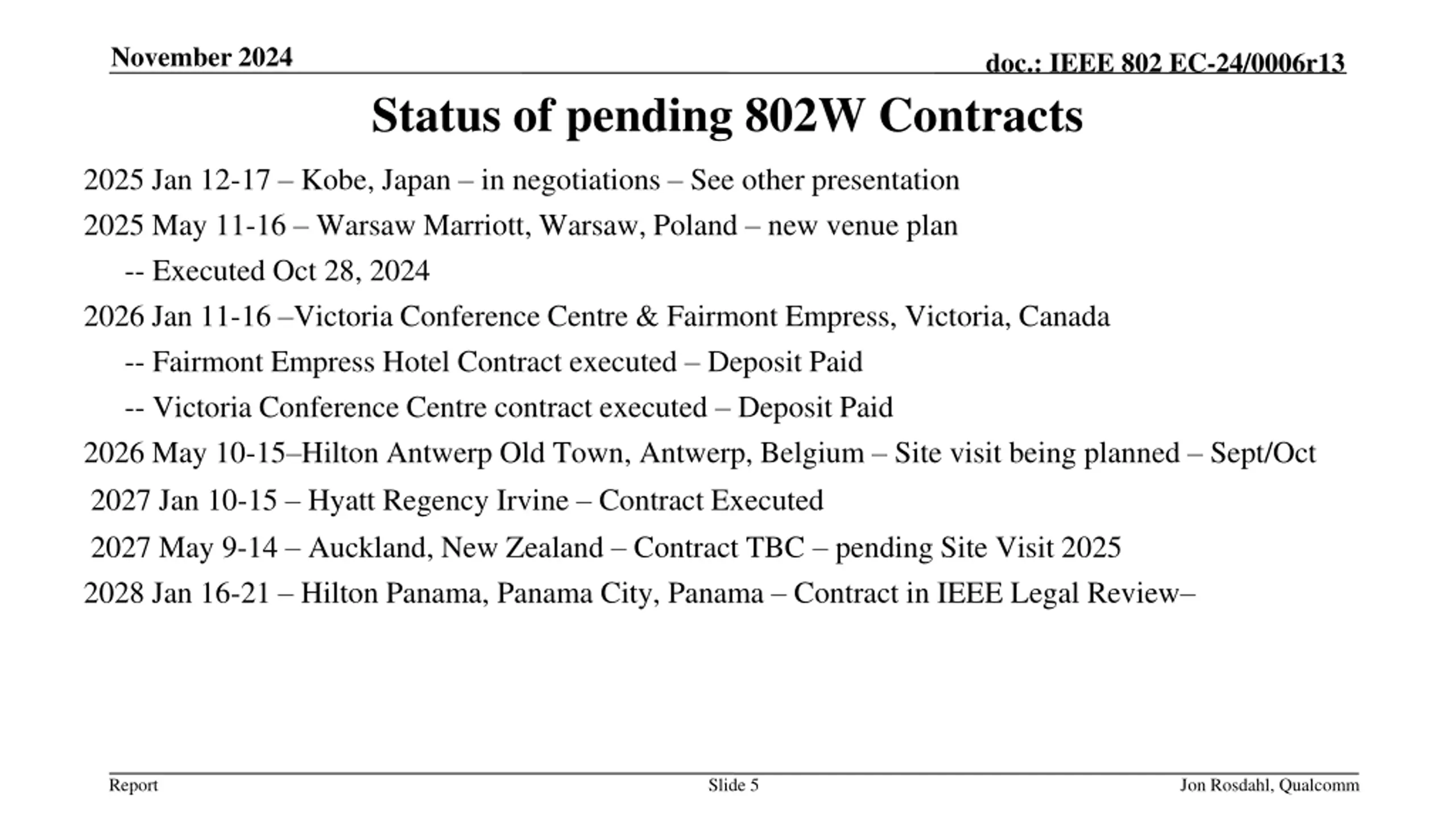 November 2024 doc.: IEEE 802 EC-24/0006r13 Status of pending 802W Contracts 2025 Jan 12-17 Kobe, Japan in negotiations See other presentation 2025 May 11-16 Warsaw Marriott, Warsaw, Poland new venue plan -- Executed Oct 28, 2024 2026 Jan 11-16 Victoria Conference Centre & Fairmont Empress, Victoria, Canada -- Fairmont Empress Hotel Contract executed Deposit Paid -- Victoria Conference Centre contract executed Deposit Paid 2026 May 10-15 Hilton Antwerp Old Town, Antwerp, Belgium Site visit being planned Sept/Oct 2027 Jan 10-15 Hyatt Regency Irvine Contract Executed 2027 May 9-14 Auckland, New Zealand Contract TBC pending Site Visit 2025 2028 Jan 16-21 Hilton Panama, Panama City, Panama Contract in IEEE Legal Review Report Slide 5 Jon Rosdahl, Qualcomm
