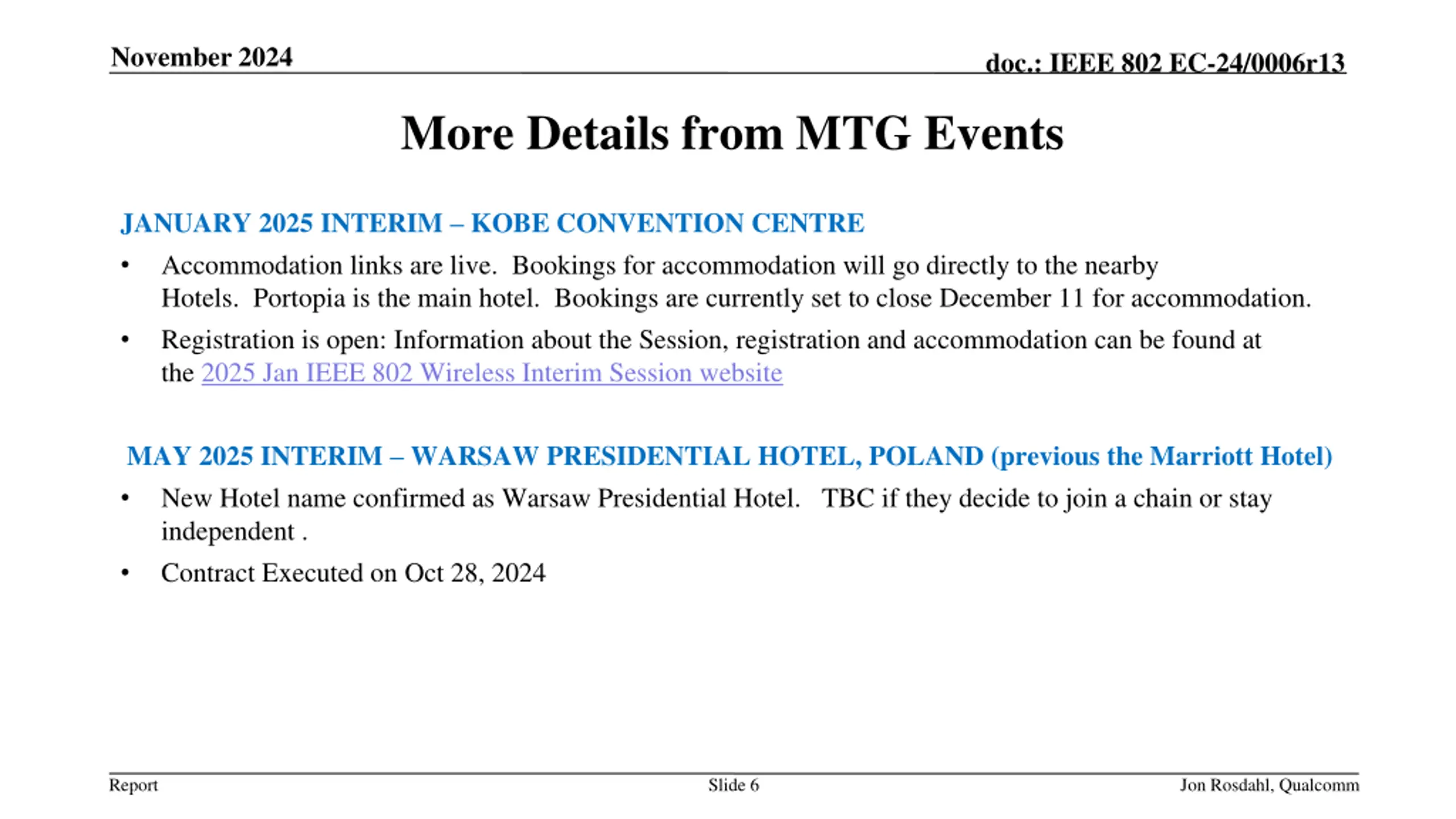 November 2024 doc.: IEEE 802 EC-24/0006r13 More Details from MTG Events JANUARY 2025 INTERIM KOBE CONVENTION CENTRE Accommodation links are live. Bookings for accommodation will go directly to the nearby Hotels. Portopia is the main hotel. Bookings are currently set to close December 11 for accommodation. Registration is open: Information about the Session, registration and accommodation can be found at the 2025 Jan IEEE 802 Wireless Interim Session website MAY 2025 INTERIM WARSAW PRESIDENTIAL HOTEL, POLAND (previous the Marriott Hotel) New Hotel name confirmed as Warsaw Presidential Hotel. TBC if they decide to join a chain or stay independent . Contract Executed on Oct 28, 2024 Report Slide 6 Jon Rosdahl, Qualcomm
