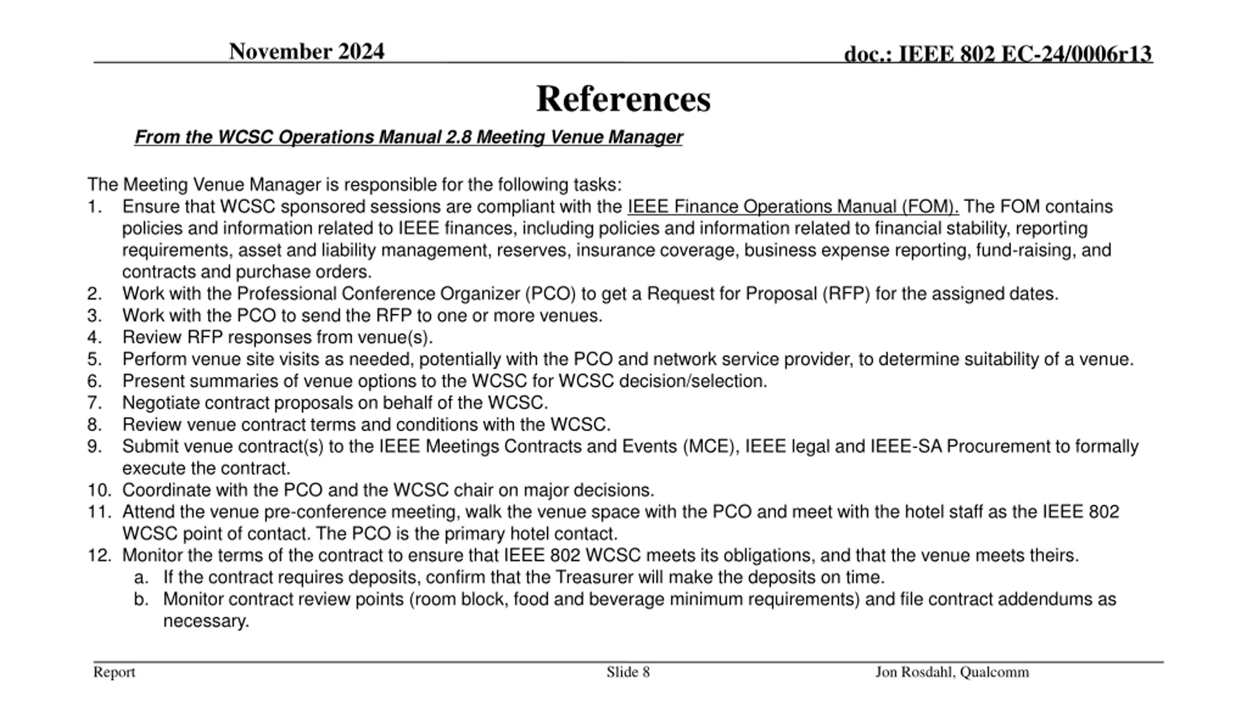 November 2024 doc.: IEEE 802 EC-24/0006r13 References From the WCSC Operations Manual 2.8 Meeting Venue Manager The Meeting Venue Manager is responsible for the following tasks: 1. Ensure that WCSC sponsored sessions are compliant with the IEEE Finance Operations Manual (FOM). The FOM contains policies and information related to IEEE finances, including policies and information related to financial stability, reporting requirements, asset and liability management, reserves, insurance coverage, business expense reporting, fund-raising, and contracts and purchase orders. 2. Work with the Professional Conference Organizer (PCO) to get a Request for Proposal (RFP) for the assigned dates. 3. Work with the PCO to send the RFP to one or more venues. 4. Review RFP responses from venue(s). 5. Perform venue site visits as needed, potentially with the PCO and network service provider, to determine suitability of a venue. 6. Present summaries of venue options to the WCSC for WCSC decision/selection. 7. Negotiate contract proposals on behalf of the WCSC. 8. Review venue contract terms and conditions with the WCSC. 9. Submit venue contract(s) to the IEEE Meetings Contracts and Events (MCE), IEEE legal and IEEE-SA Procurement to formally execute the contract. 10. Coordinate with the PCO and the WCSC chair on major decisions. 11. Attend the venue pre-conference meeting, walk the venue space with the PCO and meet with the hotel staff as the IEEE 802 WCSC point of contact. The PCO is the primary hotel contact. 12. Monitor the terms of the contract to ensure that IEEE 802 WCSC meets its obligations, and that the venue meets theirs. a. If the contract requires deposits, confirm that the Treasurer will make the deposits on time. b. Monitor contract review points (room block, food and beverage minimum requirements) and file contract addendums as necessary. Report Slide 8 Jon Rosdahl, Qualcomm