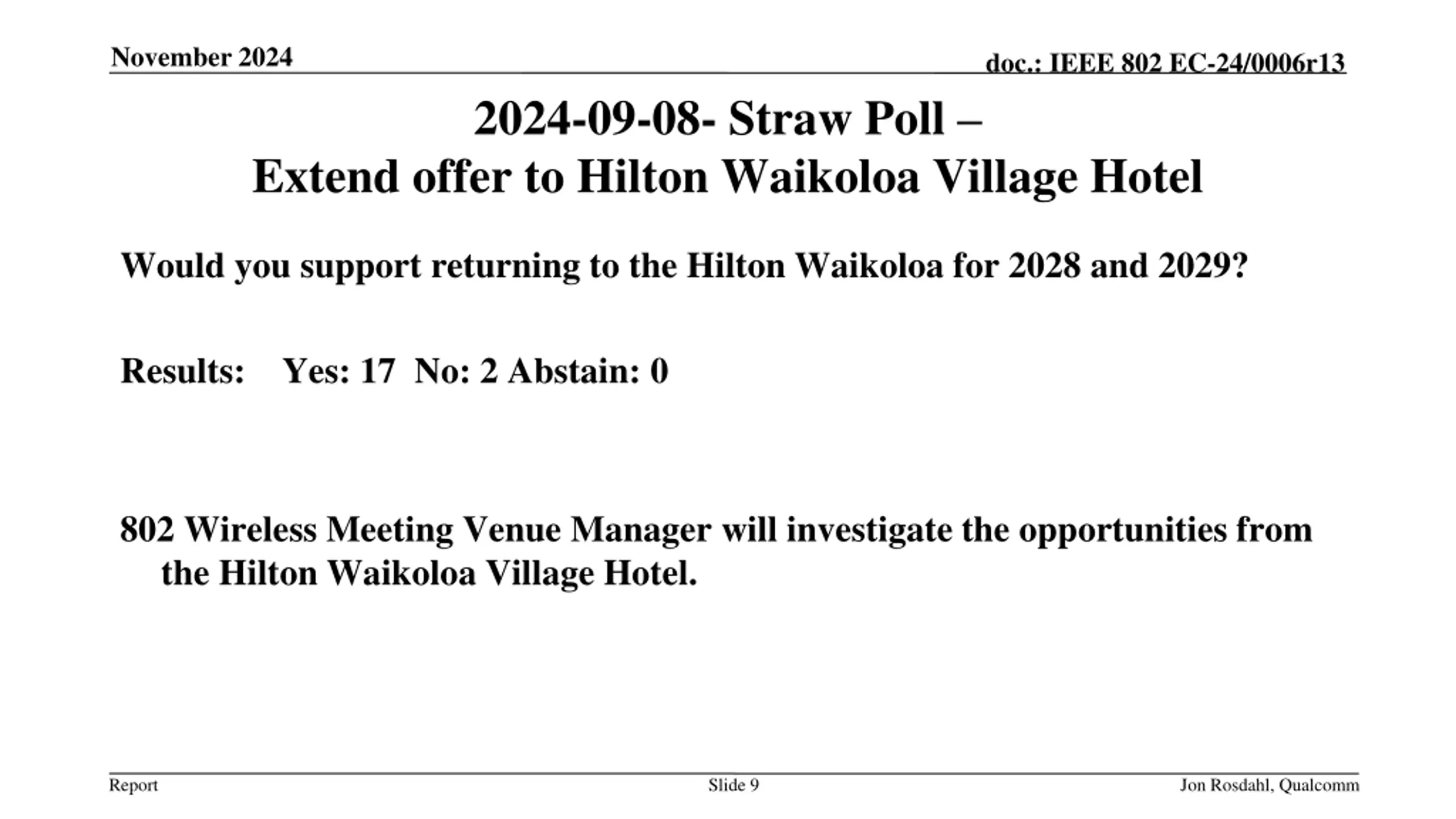 November 2024 doc.: IEEE 802 EC-24/0006r13 2024-09-08- Straw Poll Extend offer to Hilton Waikoloa Village Hotel Would you support returning to the Hilton Waikoloa for 2028 and 2029? Results: Yes: 17 No: 2 Abstain: 0 802 Wireless Meeting Venue Manager will investigate the opportunities from the Hilton Waikoloa Village Hotel. Report Slide 9 Jon Rosdahl, Qualcomm