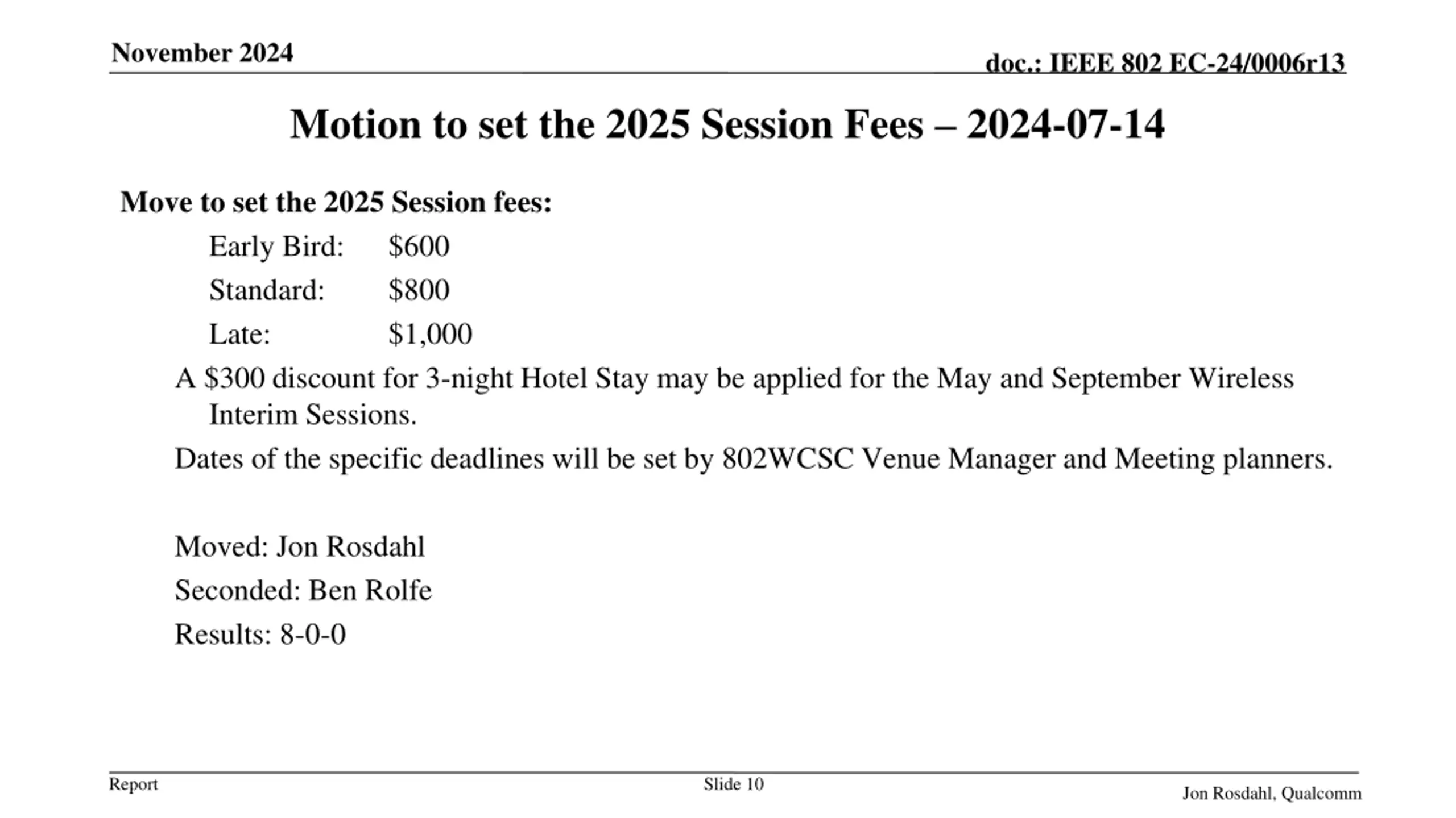 November 2024 doc.: IEEE 802 EC-24/0006r13 Motion to set the 2025 Session Fees 2024-07-14 Move to set the 2025 Session fees: Early Bird: Standard: Late: A $300 discount for 3-night Hotel Stay may be applied for the May and September Wireless Interim Sessions. Dates of the specific deadlines will be set by 802WCSC Venue Manager and Meeting planners. $600 $800 $1,000 Moved: Jon Rosdahl Seconded: Ben Rolfe Results: 8-0-0 Report Slide 10 Jon Rosdahl, Qualcomm