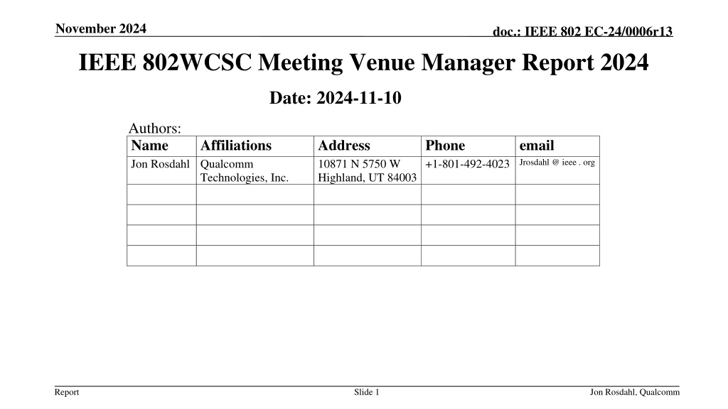 November 2024 doc.: IEEE 802 EC-24/0006r13 IEEE 802WCSC Meeting Venue Manager Report 2024 Date: 2024-11-10 Authors: Name Jon Rosdahl Qualcomm Affiliations Address 10871 N 5750 W Highland, UT 84003 Phone +1-801-492-4023 Jrosdahl @ ieee . org email Technologies, Inc. Report Slide 1 Jon Rosdahl, Qualcomm