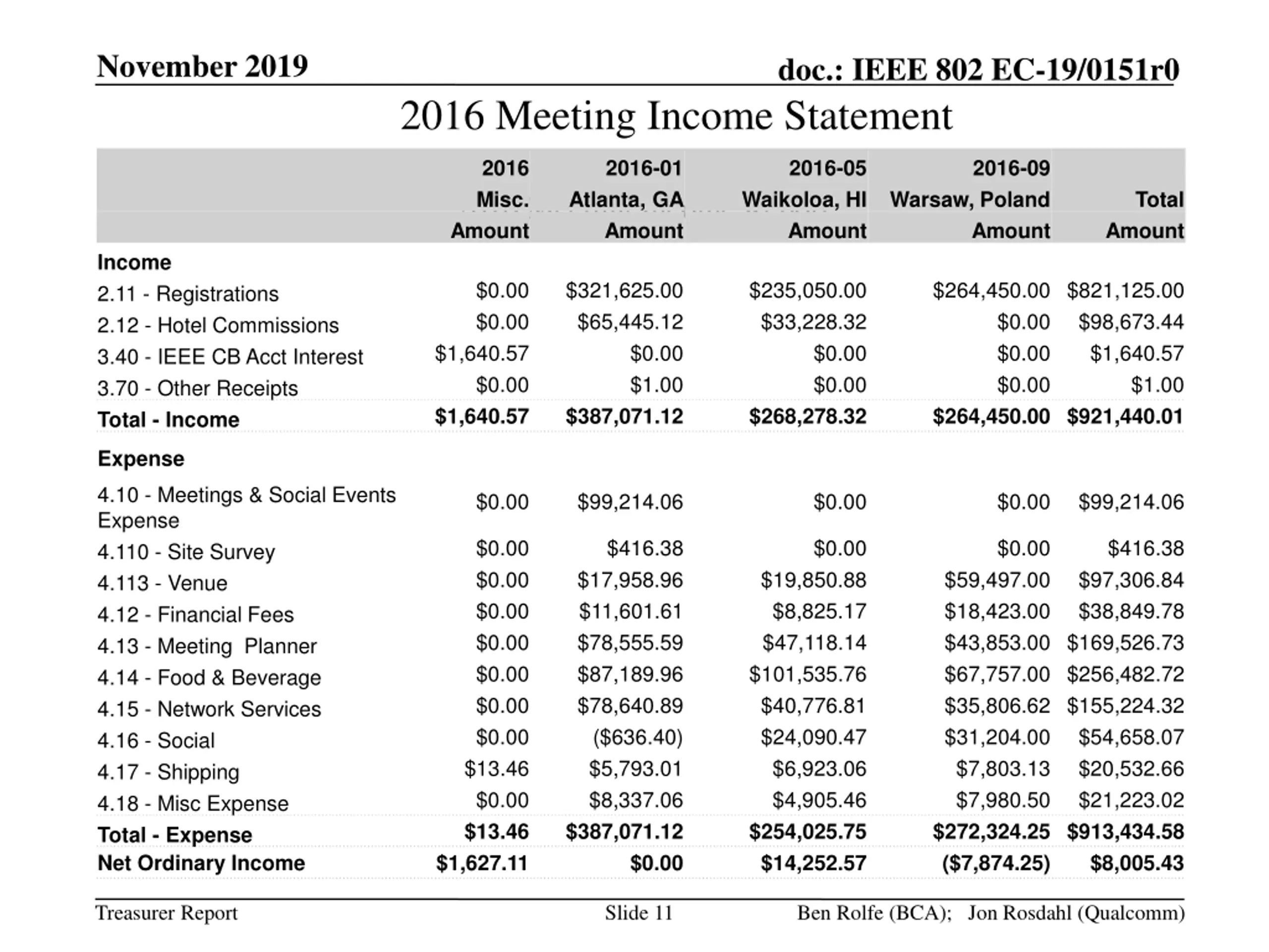 November 2019 doc.: IEEE 802 EC-19/0151r0 2016 Meeting Income Statement 2016 Misc. 2016-01 Atlanta, GA 2016-05 2016-09 Waikoloa, HI Amount Warsaw, Poland Total 2016 Meeting Income Report Amount Amount Amount Amount Income 2.11 - Registrations 2.12 - Hotel Commissions 3.40 - IEEE CB Acct Interest 3.70 - Other Receipts Total - Income $0.00 $0.00 $321,625.00 $65,445.12 $235,050.00 $33,228.32 $264,450.00 $821,125.00 $0.00 $0.00 $0.00 $264,450.00 $921,440.01 $98,673.44 $1,640.57 $1.00 $1,640.57 $0.00 $1,640.57 $0.00 $1.00 $0.00 $0.00 $387,071.12 $268,278.32 Expense 4.10 - Meetings & Social Events Expense 4.110 - Site Survey 4.113 - Venue 4.12 - Financial Fees 4.13 - Meeting Planner 4.14 - Food & Beverage 4.15 - Network Services 4.16 - Social 4.17 - Shipping 4.18 - Misc Expense Total - Expense Net Ordinary Income $0.00 $99,214.06 $0.00 $0.00 $99,214.06 $0.00 $0.00 $0.00 $0.00 $0.00 $0.00 $0.00 $13.46 $0.00 $13.46 $1,627.11 $416.38 $17,958.96 $11,601.61 $78,555.59 $87,189.96 $78,640.89 ($636.40) $5,793.01 $8,337.06 $387,071.12 $0.00 $0.00 $416.38 $97,306.84 $38,849.78 $19,850.88 $8,825.17 $47,118.14 $101,535.76 $40,776.81 $24,090.47 $6,923.06 $4,905.46 $254,025.75 $14,252.57 $59,497.00 $18,423.00 $43,853.00 $169,526.73 $67,757.00 $256,482.72 $35,806.62 $155,224.32 $31,204.00 $7,803.13 $7,980.50 $272,324.25 $913,434.58 ($7,874.25) $54,658.07 $20,532.66 $21,223.02 $0.00 $8,005.43 Treasurer Report Slide 11 Ben Rolfe (BCA); Jon Rosdahl (Qualcomm)