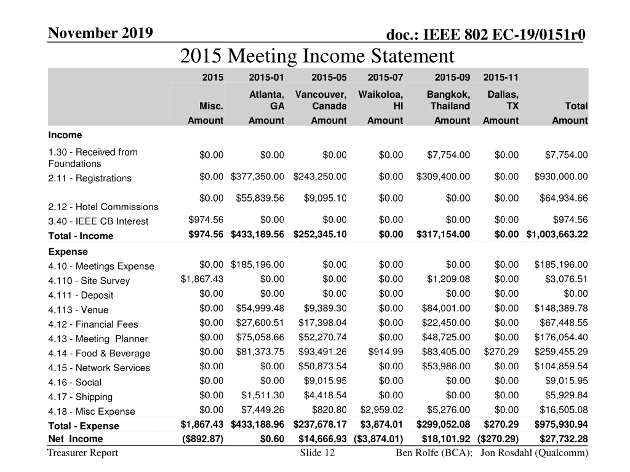 November 2019 doc.: IEEE 802 EC-19/0151r0 2015 Meeting Income Statement 2015 2015-01 2015-05 2015-07 2015-09 2015-11 Atlanta, Vancouver, Canada Amount Waikoloa, Bangkok, Thailand Amount Dallas, 2015 Meeting Income Report GA Amount Misc. Amount HI TX Total Amount Amount Amount Income 1.30 - Received from Foundations 2.11 - Registrations $0.00 $0.00 $0.00 $0.00 $7,754.00 $0.00 $7,754.00 $0.00 $377,350.00 $243,250.00 $0.00 $309,400.00 $0.00 $930,000.00 $0.00 $55,839.56 $9,095.10 $0.00 $0.00 $0.00 $64,934.66 2.12 - Hotel Commissions 3.40 - IEEE CB Interest Total - Income Expense 4.10 - Meetings Expense 4.110 - Site Survey 4.111 - Deposit 4.113 - Venue 4.12 - Financial Fees 4.13 - Meeting Planner 4.14 - Food & Beverage 4.15 - Network Services 4.16 - Social 4.17 - Shipping 4.18 - Misc Expense Total - Expense Net Income $974.56 $974.56 $433,189.56 $252,345.10 $0.00 $0.00 $0.00 $0.00 $0.00 $0.00 $0.00 $1,003,663.22 $974.56 $317,154.00 $0.00 $185,196.00 $1,867.43 $0.00 $0.00 $0.00 $0.00 $0.00 $0.00 $0.00 $0.00 $0.00 $1,867.43 $433,188.96 $237,678.17 ($892.87) $0.60 $0.00 $0.00 $0.00 $0.00 $0.00 $0.00 $0.00 $0.00 $0.00 $914.99 $0.00 $0.00 $0.00 $2,959.02 $3,874.01 $0.00 $0.00 $0.00 $0.00 $0.00 $0.00 $0.00 $270.29 $0.00 $0.00 $0.00 $0.00 $270.29 $185,196.00 $3,076.51 $0.00 $0.00 $1,209.08 $0.00 $84,001.00 $22,450.00 $48,725.00 $83,405.00 $53,986.00 $0.00 $0.00 $5,276.00 $299,052.08 $18,101.92 ($270.29) $0.00 $54,999.48 $27,600.51 $75,058.66 $81,373.75 $0.00 $0.00 $1,511.30 $7,449.26 $9,389.30 $17,398.04 $52,270.74 $93,491.26 $50,873.54 $9,015.95 $4,418.54 $820.80 $148,389.78 $67,448.55 $176,054.40 $259,455.29 $104,859.54 $9,015.95 $5,929.84 $16,505.08 $975,930.94 $27,732.28 $14,666.93 ($3,874.01) Treasurer Report Slide 12 Ben Rolfe (BCA); Jon Rosdahl (Qualcomm)