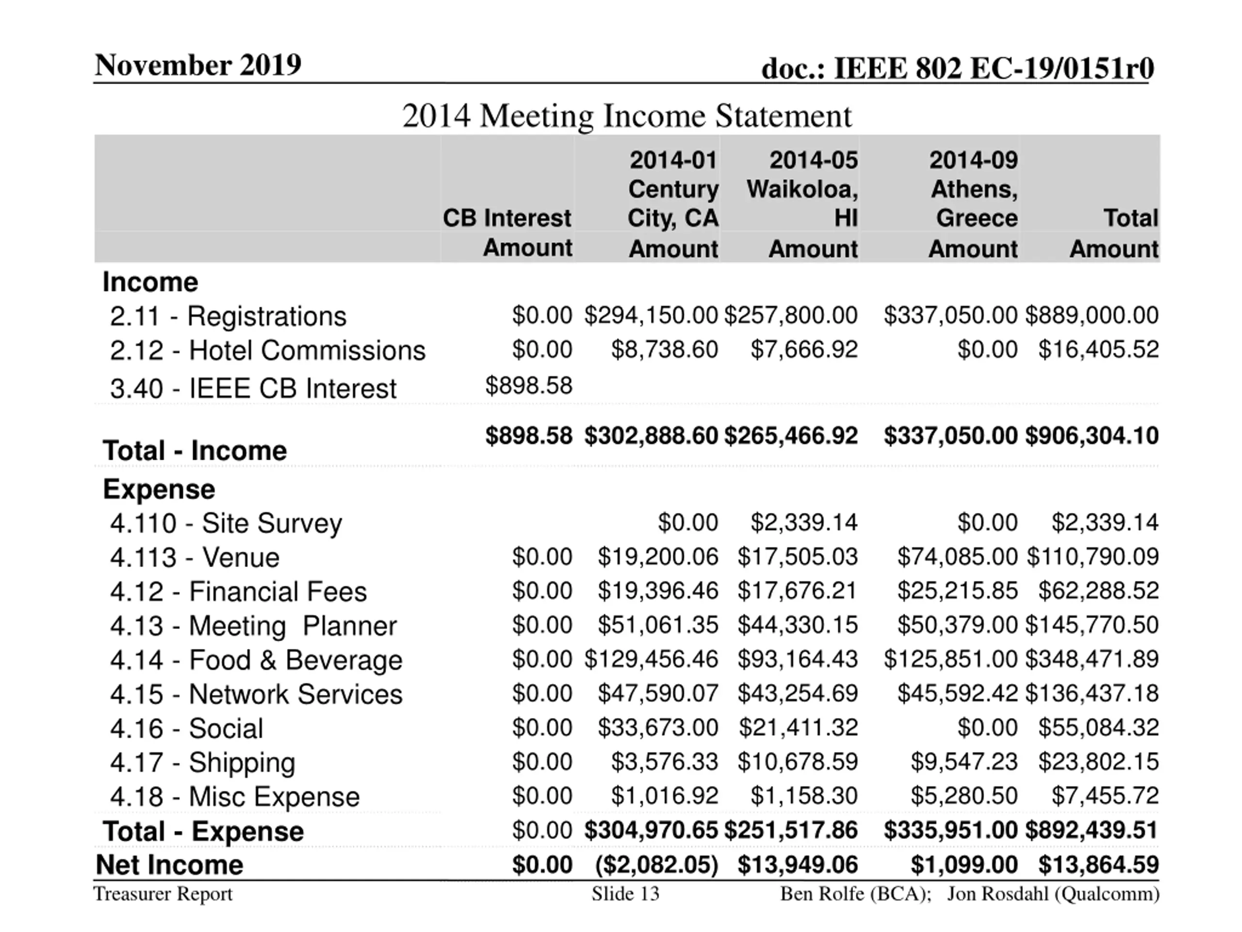 November 2019 doc.: IEEE 802 EC-19/0151r0 2014 Meeting Income Statement 2014-01 Century City, CA Amount 2014-05 Waikoloa, 2014-09 Athens, Greece Amount CB Interest Amount HI Total Amount Amount Income 2.11 - Registrations 2.12 - Hotel Commissions 3.40 - IEEE CB Interest $0.00 $294,150.00 $257,800.00 $337,050.00 $889,000.00 $0.00 $8,738.60 $7,666.92 $898.58 $0.00 $16,405.52 $898.58 $302,888.60 $265,466.92 $337,050.00 $906,304.10 Total - Income Expense 4.110 - Site Survey 4.113 - Venue 4.12 - Financial Fees 4.13 - Meeting Planner 4.14 - Food & Beverage 4.15 - Network Services 4.16 - Social 4.17 - Shipping 4.18 - Misc Expense Total - Expense Net Income $0.00 $2,339.14 $0.00 $2,339.14 $0.00 $19,200.06 $17,505.03 $0.00 $19,396.46 $17,676.21 $0.00 $51,061.35 $44,330.15 $0.00 $129,456.46 $93,164.43 $125,851.00 $348,471.89 $0.00 $47,590.07 $43,254.69 $0.00 $33,673.00 $21,411.32 $0.00 $3,576.33 $10,678.59 $0.00 $1,016.92 $1,158.30 $0.00 $304,970.65 $251,517.86 $335,951.00 $892,439.51 $0.00 ($2,082.05) $13,949.06 $74,085.00 $110,790.09 $25,215.85 $62,288.52 $50,379.00 $145,770.50 $45,592.42 $136,437.18 $0.00 $55,084.32 $9,547.23 $23,802.15 $5,280.50 $7,455.72 $1,099.00 $13,864.59 Treasurer Report Slide 13 Ben Rolfe (BCA); Jon Rosdahl (Qualcomm)