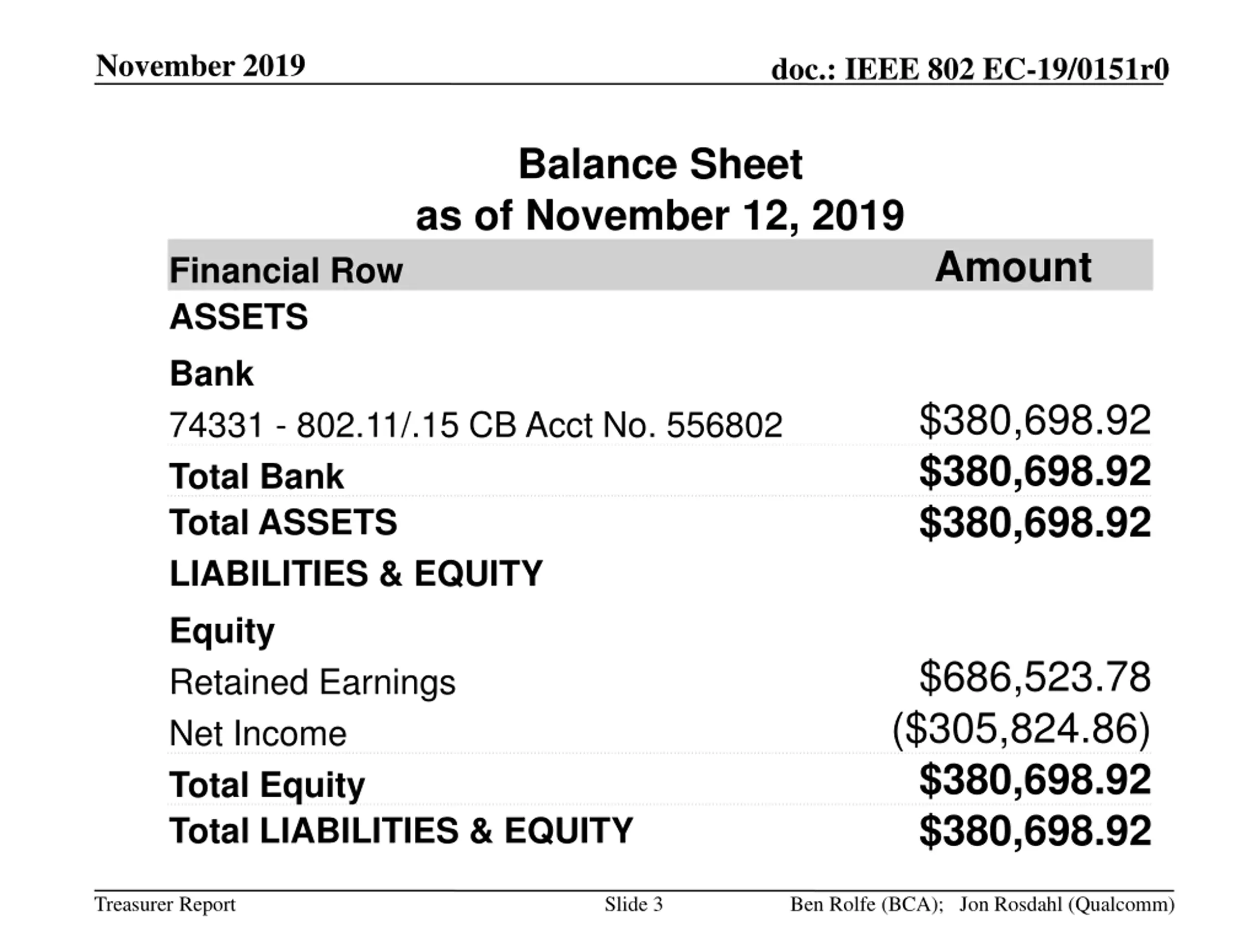 November 2019 doc.: IEEE 802 EC-19/0151r0 Balance Sheet as of November 12, 2019 Amount Financial Row ASSETS Bank 74331 - 802.11/.15 CB Acct No. 556802 Total Bank Total ASSETS LIABILITIES & EQUITY Equity Retained Earnings Net Income Total Equity Total LIABILITIES & EQUITY $380,698.92 $380,698.92 $380,698.92 $686,523.78 ($305,824.86) $380,698.92 $380,698.92 Treasurer Report Slide 3 Ben Rolfe (BCA); Jon Rosdahl (Qualcomm)