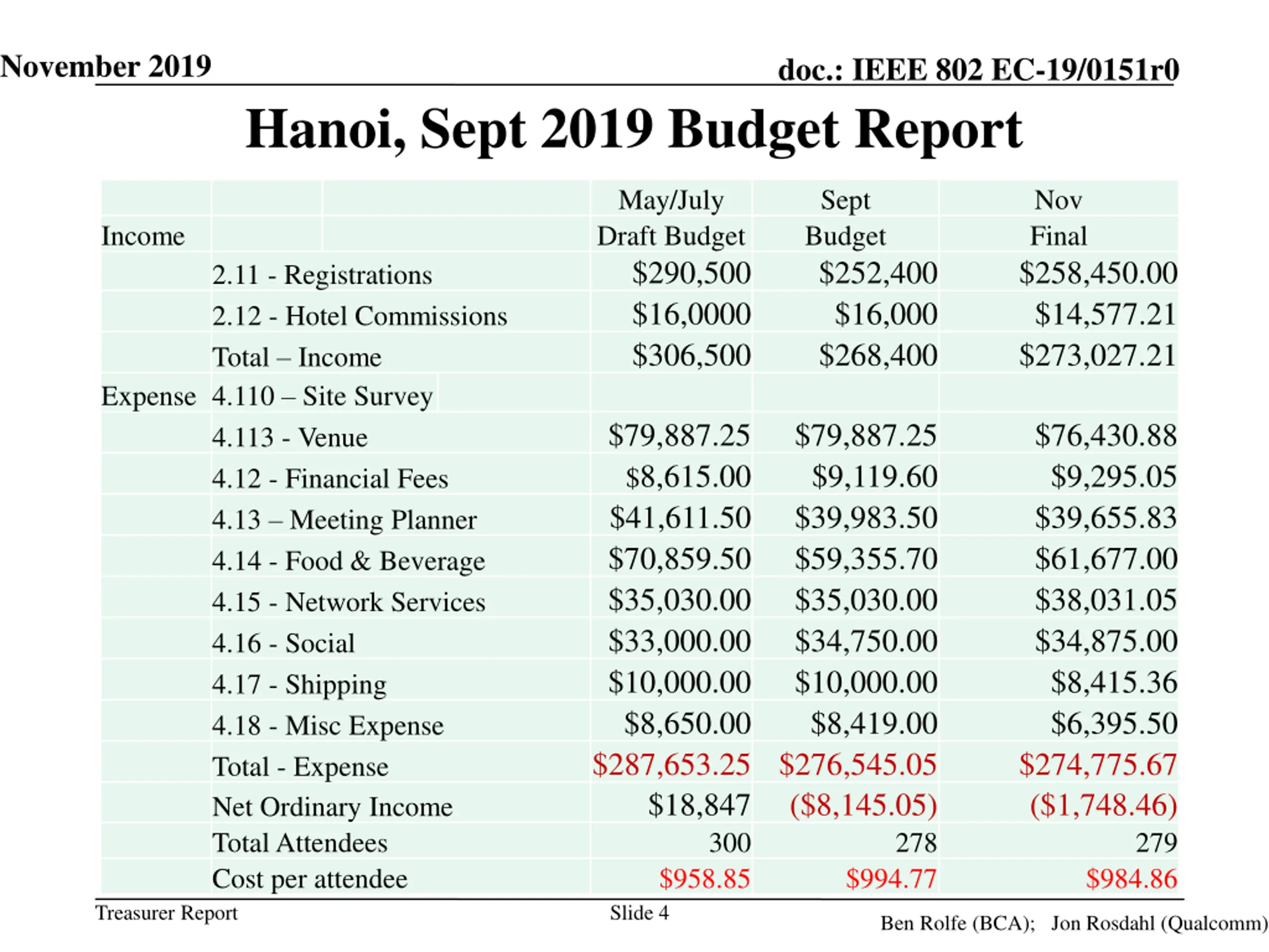 November 2019 doc.: IEEE 802 EC-19/0151r0 Hanoi, Sept 2019 Budget Report May/July Draft Budget $290,500 $16,0000 $306,500 Sept Budget $252,400 $16,000 $268,400 Nov Final $258,450.00 $14,577.21 $273,027.21 Income 2.11 - Registrations 2.12 - Hotel Commissions Total Income Expense 4.110 Site Survey 4.113 - Venue 4.12 - Financial Fees 4.13 Meeting Planner 4.14 - Food & Beverage 4.15 - Network Services 4.16 - Social 4.17 - Shipping 4.18 - Misc Expense Total - Expense Net Ordinary Income Total Attendees Cost per attendee $79,887.25 $8,615.00 $41,611.50 $70,859.50 $35,030.00 $33,000.00 $10,000.00 $8,650.00 $287,653.25 $276,545.05 $18,847 300 $958.85 Slide 4 $79,887.25 $9,119.60 $39,983.50 $59,355.70 $35,030.00 $34,750.00 $10,000.00 $8,419.00 $76,430.88 $9,295.05 $39,655.83 $61,677.00 $38,031.05 $34,875.00 $8,415.36 $6,395.50 $274,775.67 ($1,748.46) ($8,145.05) 278 279 $994.77 $984.86 Treasurer Report Ben Rolfe (BCA); Jon Rosdahl (Qualcomm)