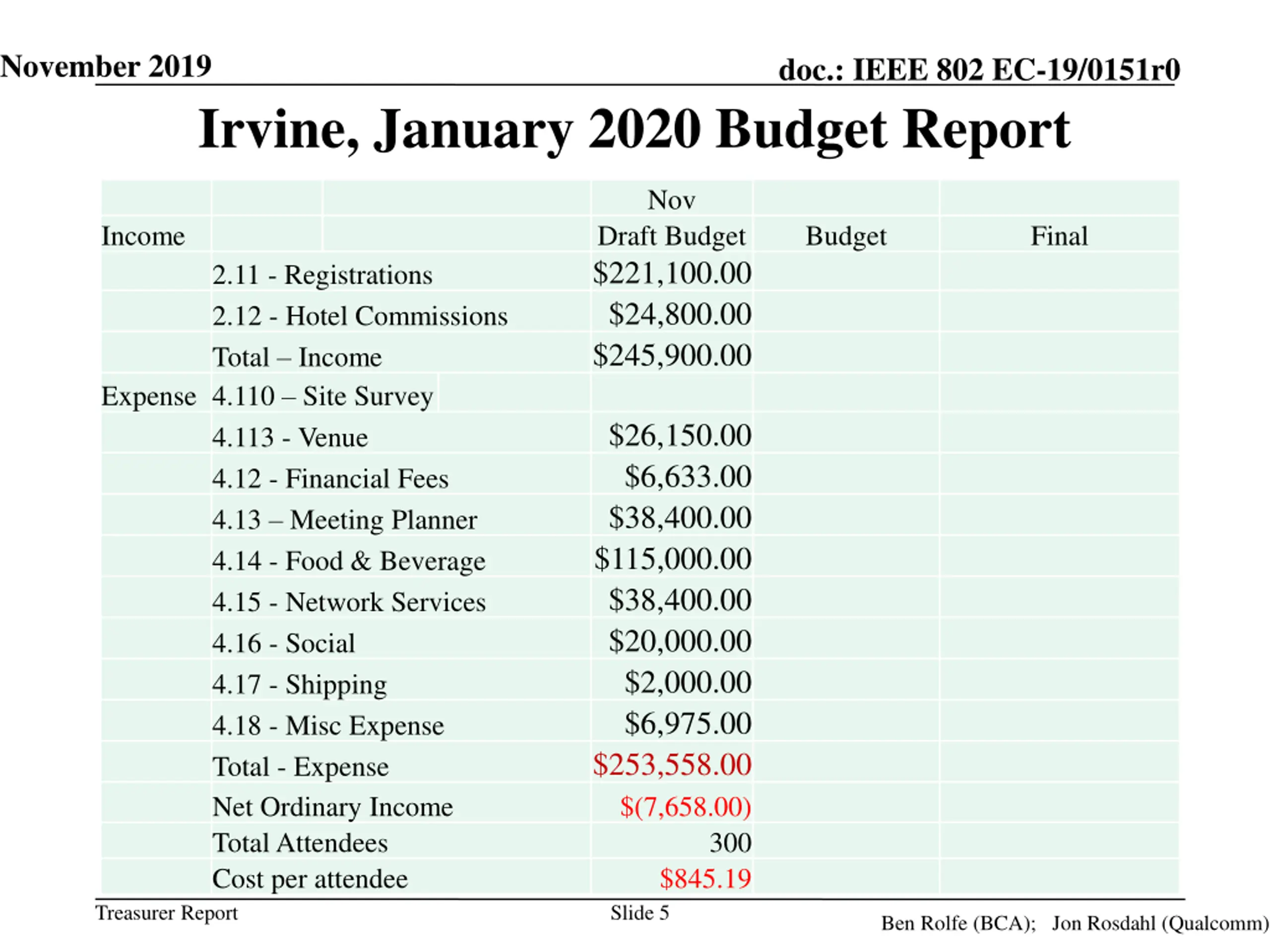 November 2019 doc.: IEEE 802 EC-19/0151r0 Irvine, January 2020 Budget Report Nov Income Draft Budget $221,100.00 $24,800.00 $245,900.00 Budget Final 2.11 - Registrations 2.12 - Hotel Commissions Total Income Expense 4.110 Site Survey 4.113 - Venue 4.12 - Financial Fees 4.13 Meeting Planner 4.14 - Food & Beverage 4.15 - Network Services 4.16 - Social 4.17 - Shipping 4.18 - Misc Expense Total - Expense Net Ordinary Income Total Attendees Cost per attendee $26,150.00 $6,633.00 $38,400.00 $115,000.00 $38,400.00 $20,000.00 $2,000.00 $6,975.00 $253,558.00 $(7,658.00) 300 $845.19 Slide 5 Treasurer Report Ben Rolfe (BCA); Jon Rosdahl (Qualcomm)