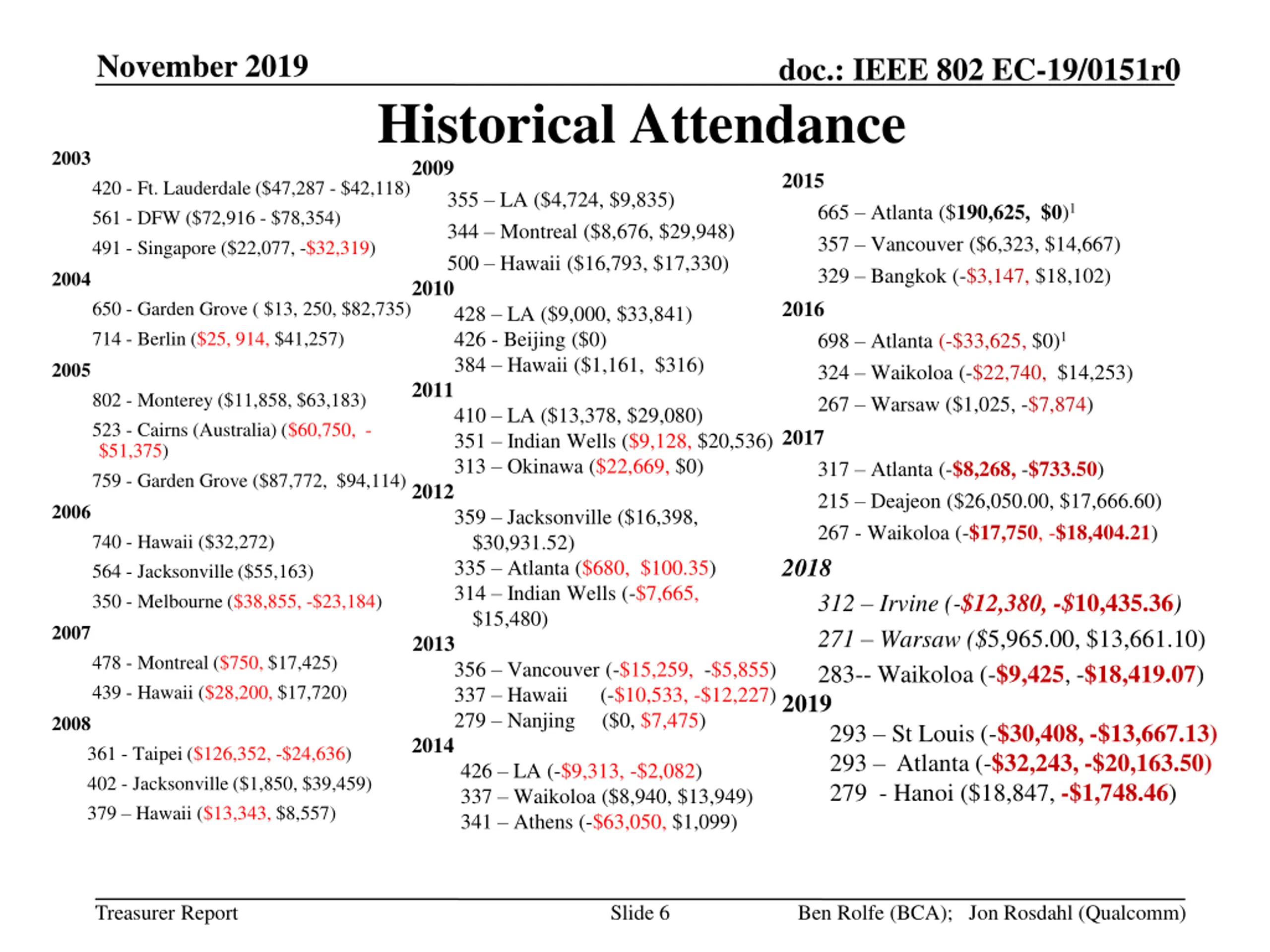 November 2019 doc.: IEEE 802 EC-19/0151r0 Historical Attendance 2009 355 LA ($4,724, $9,835) 344 Montreal ($8,676, $29,948) 500 Hawaii ($16,793, $17,330) 2010 428 LA ($9,000, $33,841) 426 - Beijing ($0) 384 Hawaii ($1,161, $316) 2011 410 LA ($13,378, $29,080) 351 Indian Wells ($9,128, $20,536) 313 Okinawa ($22,669, $0) 2012 359 Jacksonville ($16,398, $30,931.52) 335 Atlanta ($680, $100.35) 314 Indian Wells (-$7,665, $15,480) 2013 356 Vancouver (-$15,259, -$5,855) 337 Hawaii (-$10,533, -$12,227) 279 Nanjing ($0, $7,475) 2014 426 LA (-$9,313, -$2,082) 337 Waikoloa ($8,940, $13,949) 341 Athens (-$63,050, $1,099) 2003 2015 420 - Ft. Lauderdale ($47,287 - $42,118) 561 - DFW ($72,916 - $78,354) 491 - Singapore ($22,077, -$32,319) 2004 650 - Garden Grove ( $13, 250, $82,735) 714 - Berlin ($25, 914, $41,257) 2005 802 - Monterey ($11,858, $63,183) 523 - Cairns (Australia) ($60,750, - $51,375) 759 - Garden Grove ($87,772, $94,114) 2006 740 - Hawaii ($32,272) 564 - Jacksonville ($55,163) 350 - Melbourne ($38,855, -$23,184) 2007 478 - Montreal ($750, $17,425) 439 - Hawaii ($28,200, $17,720) 2008 361 - Taipei ($126,352, -$24,636) 402 - Jacksonville ($1,850, $39,459) 379 Hawaii ($13,343, $8,557) 665 Atlanta ($190,625, $0)1 357 Vancouver ($6,323, $14,667) 329 Bangkok (-$3,147, $18,102) 2016 698 Atlanta (-$33,625, $0)1 324 Waikoloa (-$22,740, $14,253) 267 Warsaw ($1,025, -$7,874) 2017 317 Atlanta (-$8,268, -$733.50) 215 Deajeon ($26,050.00, $17,666.60) 267 - Waikoloa (-$17,750, -$18,404.21) 2018 312 Irvine (-$12,380, -$10,435.36) 271 Warsaw ($5,965.00, $13,661.10) 283-- Waikoloa (-$9,425, -$18,419.07) 2019 293 St Louis (-$30,408, -$13,667.13) 293 Atlanta (-$32,243, -$20,163.50) 279 - Hanoi ($18,847, -$1,748.46) Treasurer Report Slide 6 Ben Rolfe (BCA); Jon Rosdahl (Qualcomm)