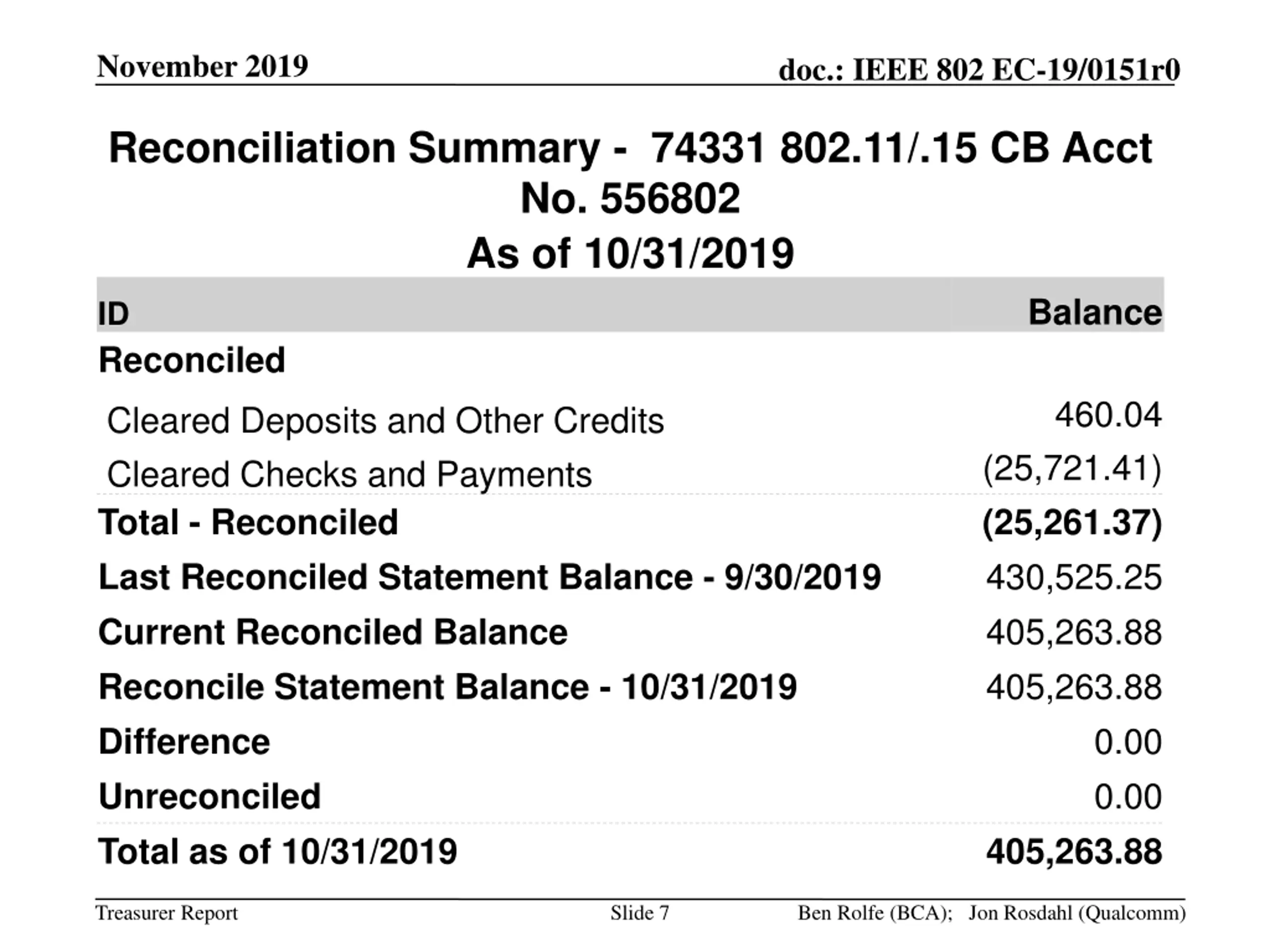 November 2019 doc.: IEEE 802 EC-19/0151r0 Reconciliation Summary - 74331 802.11/.15 CB Acct No. 556802 As of 10/31/2019 Balance ID Reconciled 460.04 Cleared Deposits and Other Credits Cleared Checks and Payments Total - Reconciled Last Reconciled Statement Balance - 9/30/2019 Current Reconciled Balance Reconcile Statement Balance - 10/31/2019 Difference Unreconciled Total as of 10/31/2019 (25,721.41) (25,261.37) 430,525.25 405,263.88 405,263.88 0.00 0.00 405,263.88 Treasurer Report Slide 7 Ben Rolfe (BCA); Jon Rosdahl (Qualcomm)