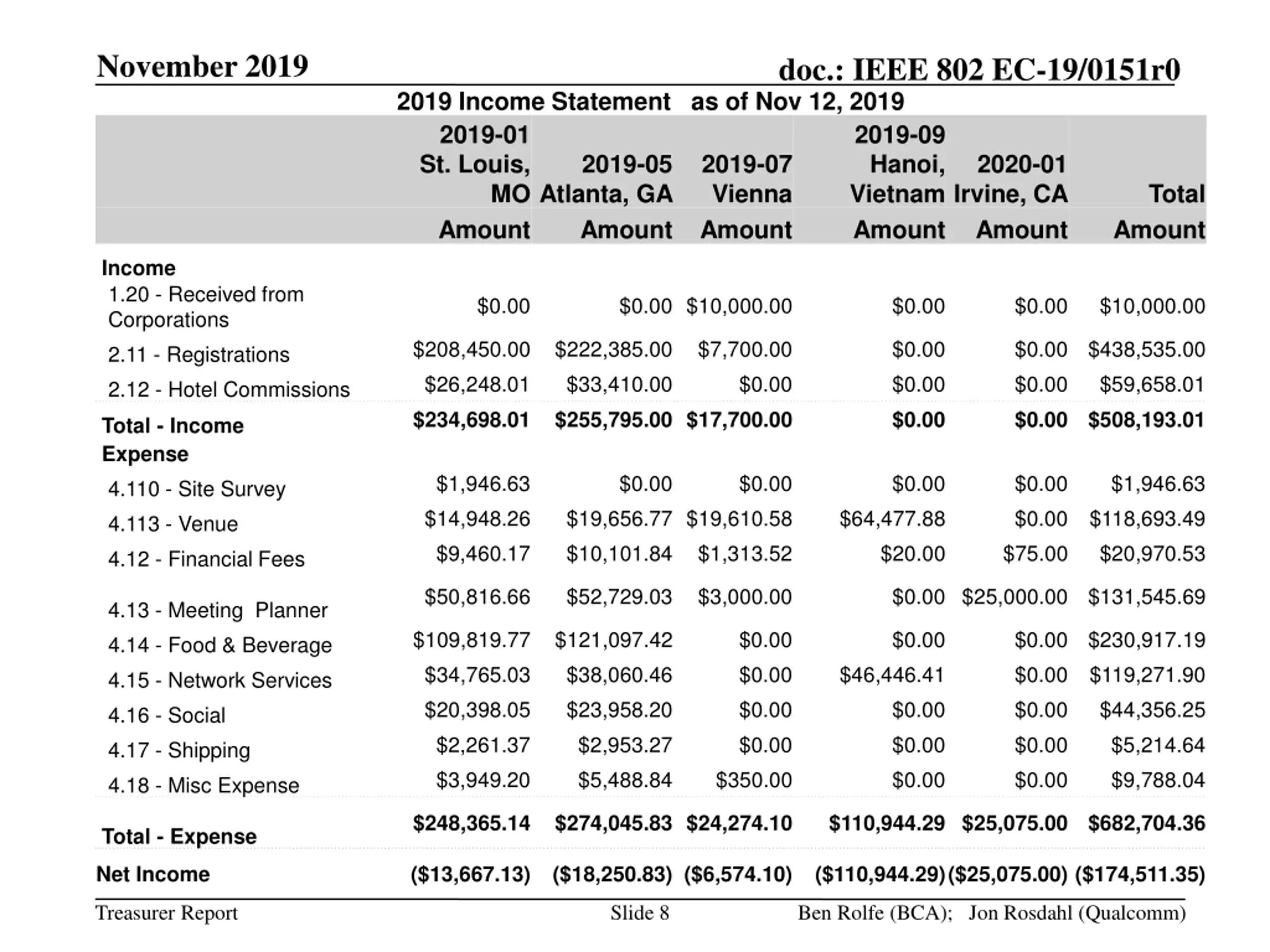 November 2019 doc.: IEEE 802 EC-19/0151r0 2019 Income Statement as of Nov 12, 2019 2019-01 St. Louis, MO Atlanta, GA Amount Amount 2019-09 Hanoi, Vietnam Amount 2019-05 2019-07 Vienna Amount 2020-01 Irvine, CA Amount Total Amount Income 1.20 - Received from Corporations 2.11 - Registrations 2.12 - Hotel Commissions $0.00 $0.00 $10,000.00 $0.00 $0.00 $10,000.00 $208,450.00 $222,385.00 $26,248.01 $7,700.00 $0.00 $0.00 $0.00 $0.00 $438,535.00 $0.00 $59,658.01 $33,410.00 $234,698.01 $255,795.00 $17,700.00 $0.00 $0.00 $508,193.01 Total - Income Expense 4.110 - Site Survey 4.113 - Venue 4.12 - Financial Fees $1,946.63 $14,948.26 $9,460.17 $0.00 $0.00 $0.00 $0.00 $0.00 $118,693.49 $75.00 $20,970.53 $1,946.63 $19,656.77 $19,610.58 $10,101.84 $64,477.88 $20.00 $1,313.52 $50,816.66 $52,729.03 $3,000.00 $0.00 $25,000.00 $131,545.69 4.13 - Meeting Planner 4.14 - Food & Beverage 4.15 - Network Services 4.16 - Social 4.17 - Shipping 4.18 - Misc Expense $109,819.77 $121,097.42 $34,765.03 $20,398.05 $2,261.37 $3,949.20 $0.00 $0.00 $0.00 $0.00 $350.00 $0.00 $0.00 $230,917.19 $0.00 $119,271.90 $0.00 $44,356.25 $0.00 $5,214.64 $0.00 $9,788.04 $38,060.46 $23,958.20 $2,953.27 $5,488.84 $46,446.41 $0.00 $0.00 $0.00 $248,365.14 $274,045.83 $24,274.10 $110,944.29 $25,075.00 $682,704.36 Total - Expense Net Income ($13,667.13) ($18,250.83) ($6,574.10) ($110,944.29)($25,075.00) ($174,511.35) Treasurer Report Slide 8 Ben Rolfe (BCA); Jon Rosdahl (Qualcomm)
