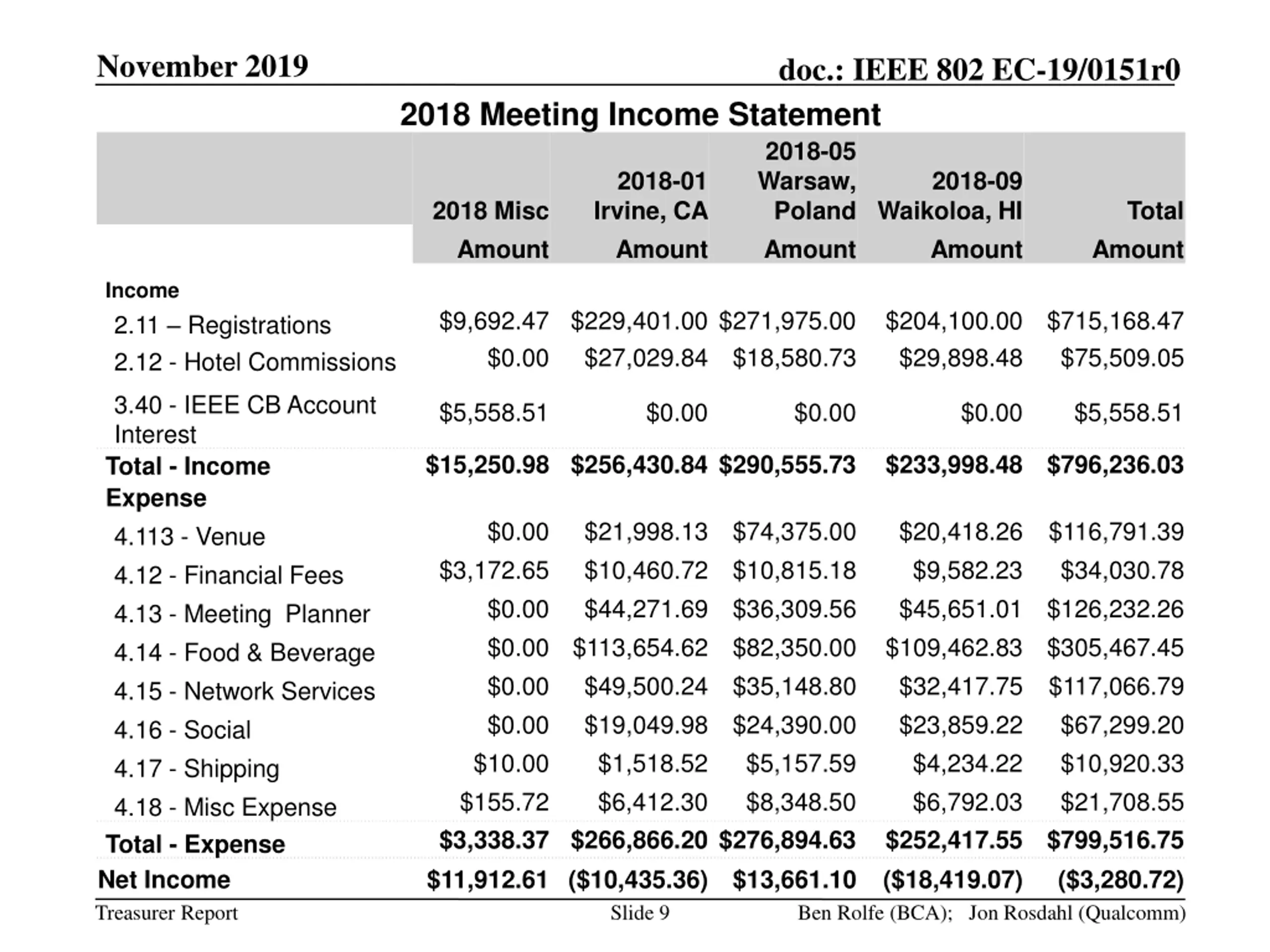 November 2019 doc.: IEEE 802 EC-19/0151r0 2018 Meeting Income Statement 2018-05 Warsaw, Poland Amount 2018-01 Irvine, CA Amount 2018-09 2018 Misc Amount Waikoloa, HI Amount Total Amount Income 2.11 Registrations 2.12 - Hotel Commissions $9,692.47 $229,401.00 $271,975.00 $0.00 $27,029.84 $18,580.73 $204,100.00 $715,168.47 $29,898.48 $75,509.05 3.40 - IEEE CB Account Interest Total - Income Expense 4.113 - Venue 4.12 - Financial Fees 4.13 - Meeting Planner 4.14 - Food & Beverage 4.15 - Network Services 4.16 - Social 4.17 - Shipping 4.18 - Misc Expense Total - Expense Net Income $5,558.51 $0.00 $0.00 $0.00 $5,558.51 $15,250.98 $256,430.84 $290,555.73 $233,998.48 $796,236.03 $21,998.13 $74,375.00 $10,460.72 $10,815.18 $44,271.69 $36,309.56 $0.00 $113,654.62 $82,350.00 $0.00 $49,500.24 $35,148.80 $0.00 $19,049.98 $24,390.00 $10.00 $1,518.52 $155.72 $6,412.30 $3,338.37 $266,866.20 $276,894.63 $11,912.61 ($10,435.36) $0.00 $20,418.26 $116,791.39 $9,582.23 $45,651.01 $126,232.26 $109,462.83 $305,467.45 $32,417.75 $117,066.79 $23,859.22 $4,234.22 $6,792.03 $252,417.55 $799,516.75 $3,172.65 $0.00 $34,030.78 $67,299.20 $10,920.33 $21,708.55 $5,157.59 $8,348.50 $13,661.10 ($18,419.07) ($3,280.72) Treasurer Report Slide 9 Ben Rolfe (BCA); Jon Rosdahl (Qualcomm)