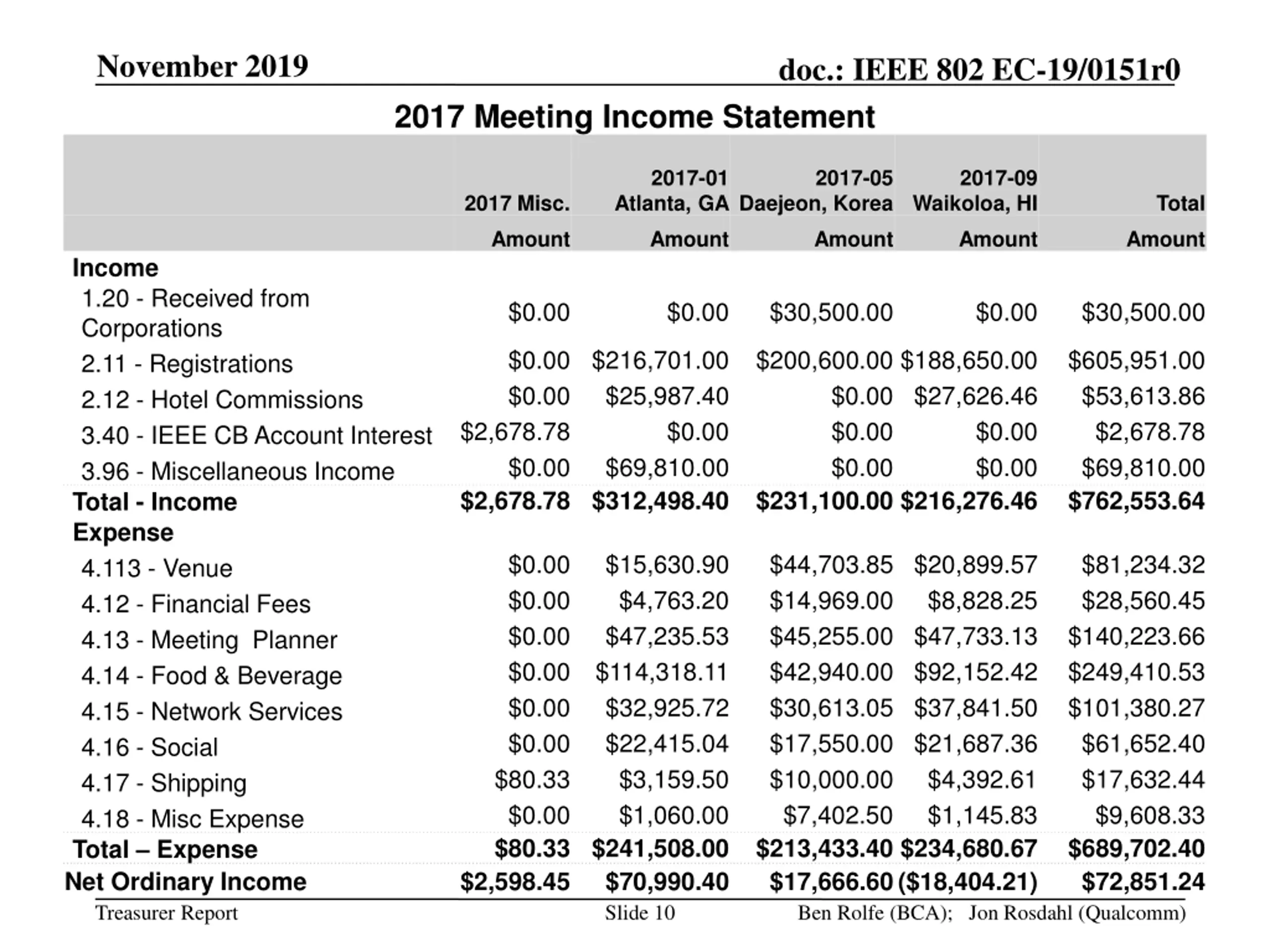 November 2019 doc.: IEEE 802 EC-19/0151r0 2017 Meeting Income Statement 2017-01 Atlanta, GA 2017-05 2017-09 2017 Misc. Daejeon, Korea Waikoloa, HI Total Amount Amount Amount Amount Amount Income 1.20 - Received from Corporations 2.11 - Registrations 2.12 - Hotel Commissions 3.40 - IEEE CB Account Interest 3.96 - Miscellaneous Income Total - Income Expense 4.113 - Venue 4.12 - Financial Fees 4.13 - Meeting Planner 4.14 - Food & Beverage 4.15 - Network Services 4.16 - Social 4.17 - Shipping 4.18 - Misc Expense Total Expense Net Ordinary Income $0.00 $0.00 $30,500.00 $0.00 $30,500.00 $0.00 $216,701.00 $200,600.00 $188,650.00 $0.00 $25,987.40 $2,678.78 $0.00 $0.00 $69,810.00 $2,678.78 $312,498.40 $231,100.00 $216,276.46 $605,951.00 $53,613.86 $2,678.78 $69,810.00 $762,553.64 $0.00 $27,626.46 $0.00 $0.00 $0.00 $0.00 $0.00 $0.00 $0.00 $0.00 $114,318.11 $0.00 $32,925.72 $0.00 $22,415.04 $80.33 $0.00 $80.33 $241,508.00 $213,433.40 $234,680.67 $2,598.45 $70,990.40 $15,630.90 $4,763.20 $47,235.53 $44,703.85 $20,899.57 $14,969.00 $45,255.00 $47,733.13 $42,940.00 $92,152.42 $30,613.05 $37,841.50 $17,550.00 $21,687.36 $10,000.00 $7,402.50 $81,234.32 $28,560.45 $140,223.66 $249,410.53 $101,380.27 $61,652.40 $17,632.44 $9,608.33 $689,702.40 $72,851.24 $8,828.25 $3,159.50 $1,060.00 $4,392.61 $1,145.83 $17,666.60 ($18,404.21) Treasurer Report Slide 10 Ben Rolfe (BCA); Jon Rosdahl (Qualcomm)