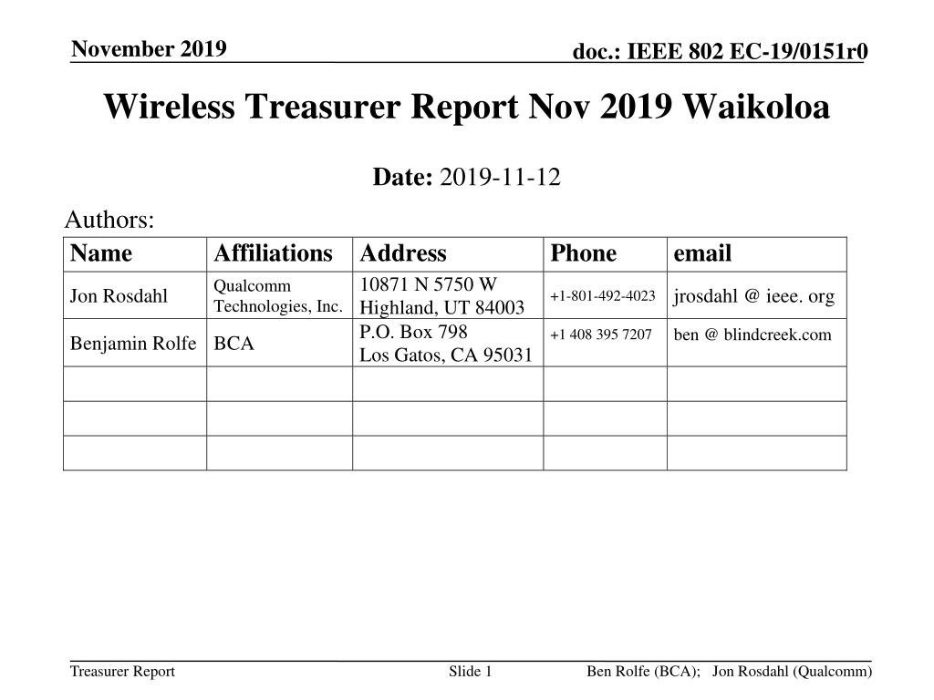 November 2019 doc.: IEEE 802 EC-19/0151r0 Wireless Treasurer Report Nov 2019 Waikoloa Date: 2019-11-12 Authors: Name Affiliations Address Qualcomm Technologies, Inc. Phone email 10871 N 5750 W Highland, UT 84003 P.O. Box 798 Los Gatos, CA 95031 Jon Rosdahl +1-801-492-4023 jrosdahl @ ieee. org ben @ blindcreek.com +1 408 395 7207 Benjamin Rolfe BCA Treasurer Report Slide 1 Ben Rolfe (BCA); Jon Rosdahl (Qualcomm)