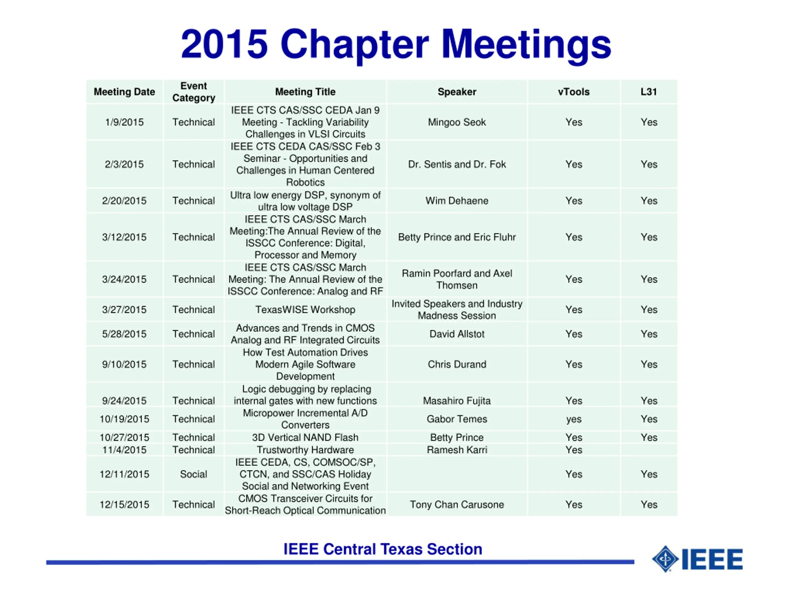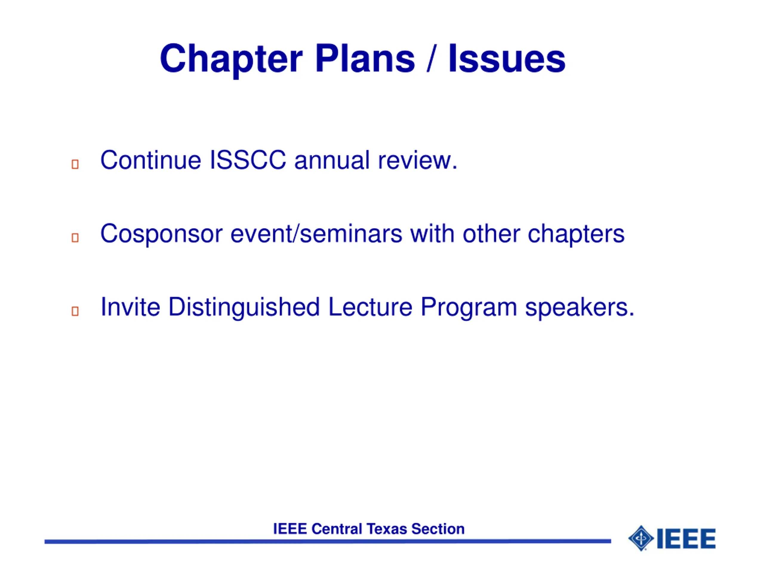 Chapter Plans / Issues Continue ISSCC annual review. Cosponsor event/seminars with other chapters Invite Distinguished Lecture Program speakers. IEEE Central Texas Section