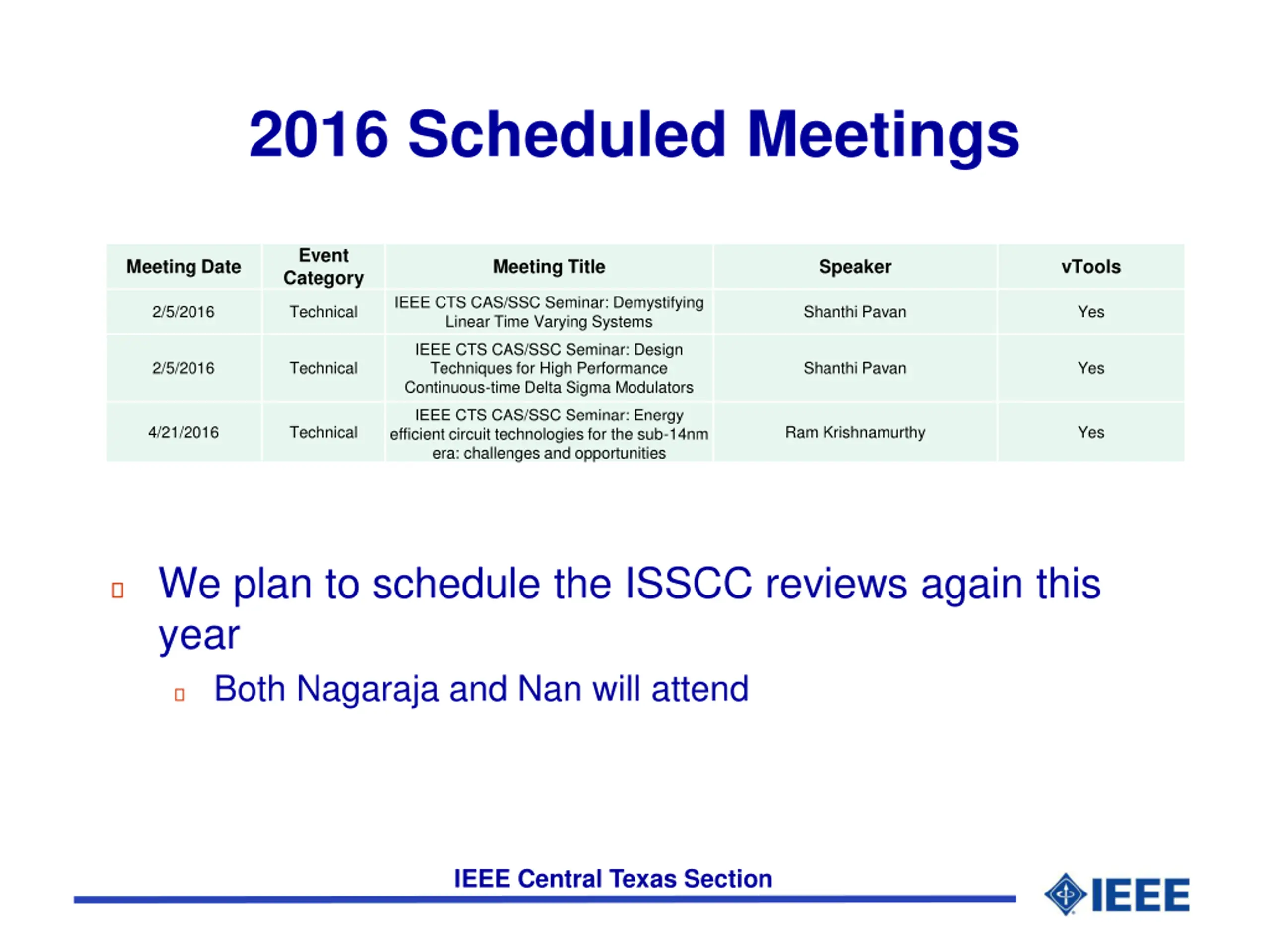 2016 Scheduled Meetings Event Category Meeting Date Meeting Title Speaker vTools IEEE CTS CAS/SSC Seminar: Demystifying Linear Time Varying Systems 2/5/2016 Technical Shanthi Pavan Yes IEEE CTS CAS/SSC Seminar: Design Techniques for High Performance Continuous-time Delta Sigma Modulators 2/5/2016 Technical Shanthi Pavan Yes IEEE CTS CAS/SSC Seminar: Energy efficient circuit technologies for the sub-14nm era: challenges and opportunities 4/21/2016 Technical Ram Krishnamurthy Yes We plan to schedule the ISSCC reviews again this year Both Nagaraja and Nan will attend IEEE Central Texas Section