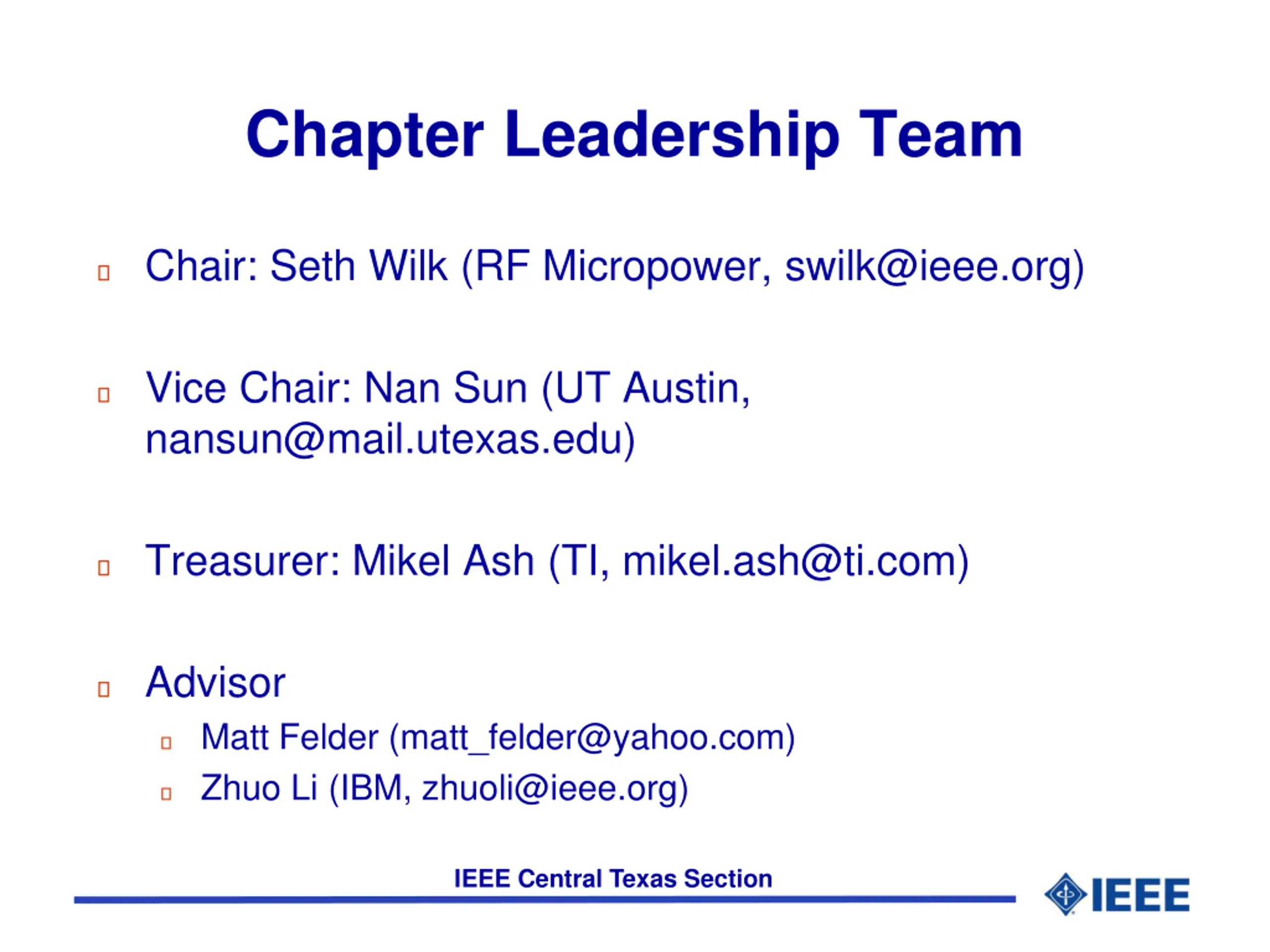 Chapter Leadership Team Chair: Seth Wilk (RF Micropower, swilk@ieee.org) Vice Chair: Nan Sun (UT Austin, nansun@mail.utexas.edu) Treasurer: Mikel Ash (TI, mikel.ash@ti.com) Advisor Matt Felder (matt_felder@yahoo.com) Zhuo Li (IBM, zhuoli@ieee.org) IEEE Central Texas Section