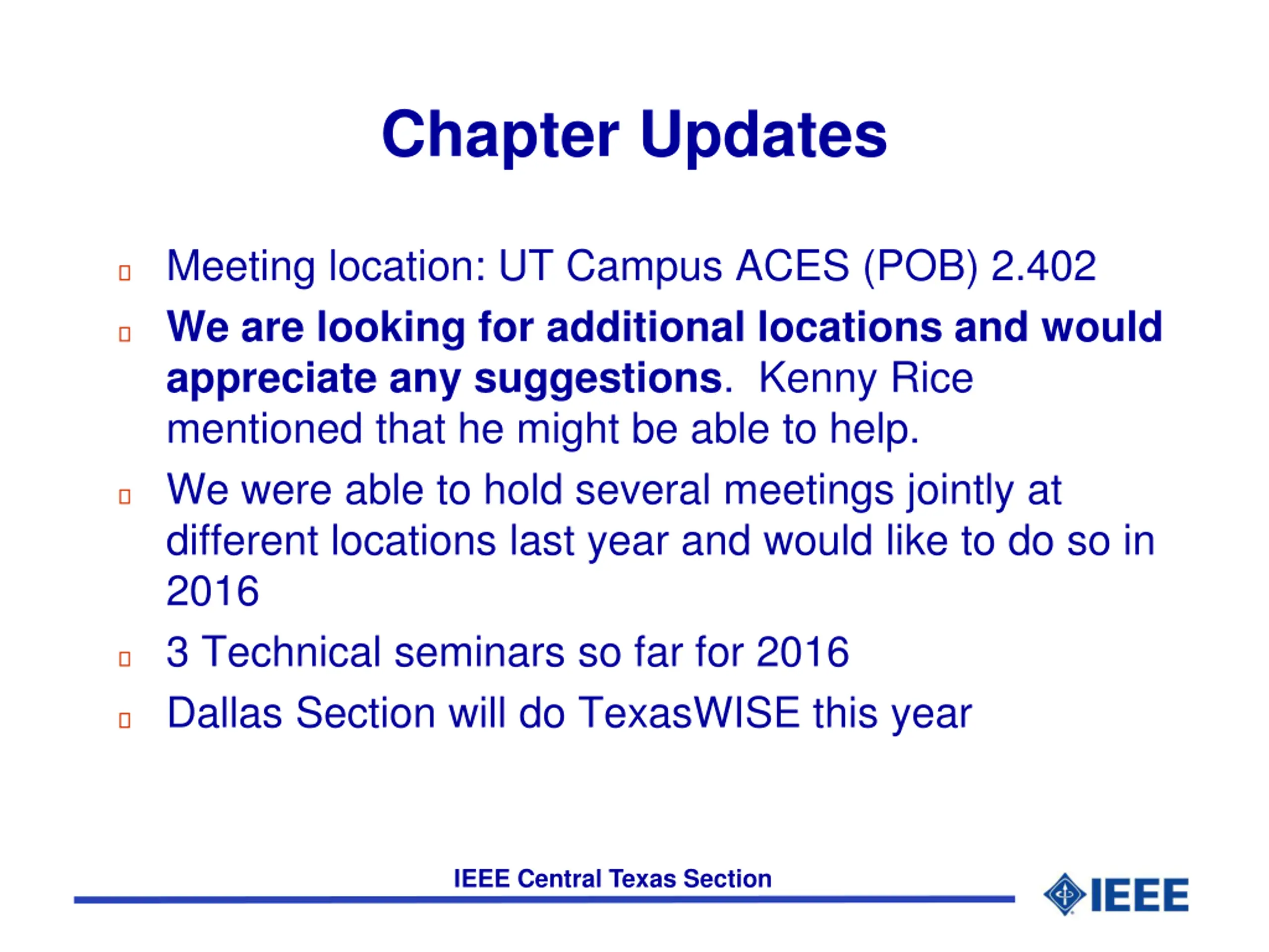 Chapter Updates Meeting location: UT Campus ACES (POB) 2.402 We are looking for additional locations and would appreciate any suggestions. Kenny Rice mentioned that he might be able to help. We were able to hold several meetings jointly at different locations last year and would like to do so in 2016 3 Technical seminars so far for 2016 Dallas Section will do TexasWISE this year IEEE Central Texas Section