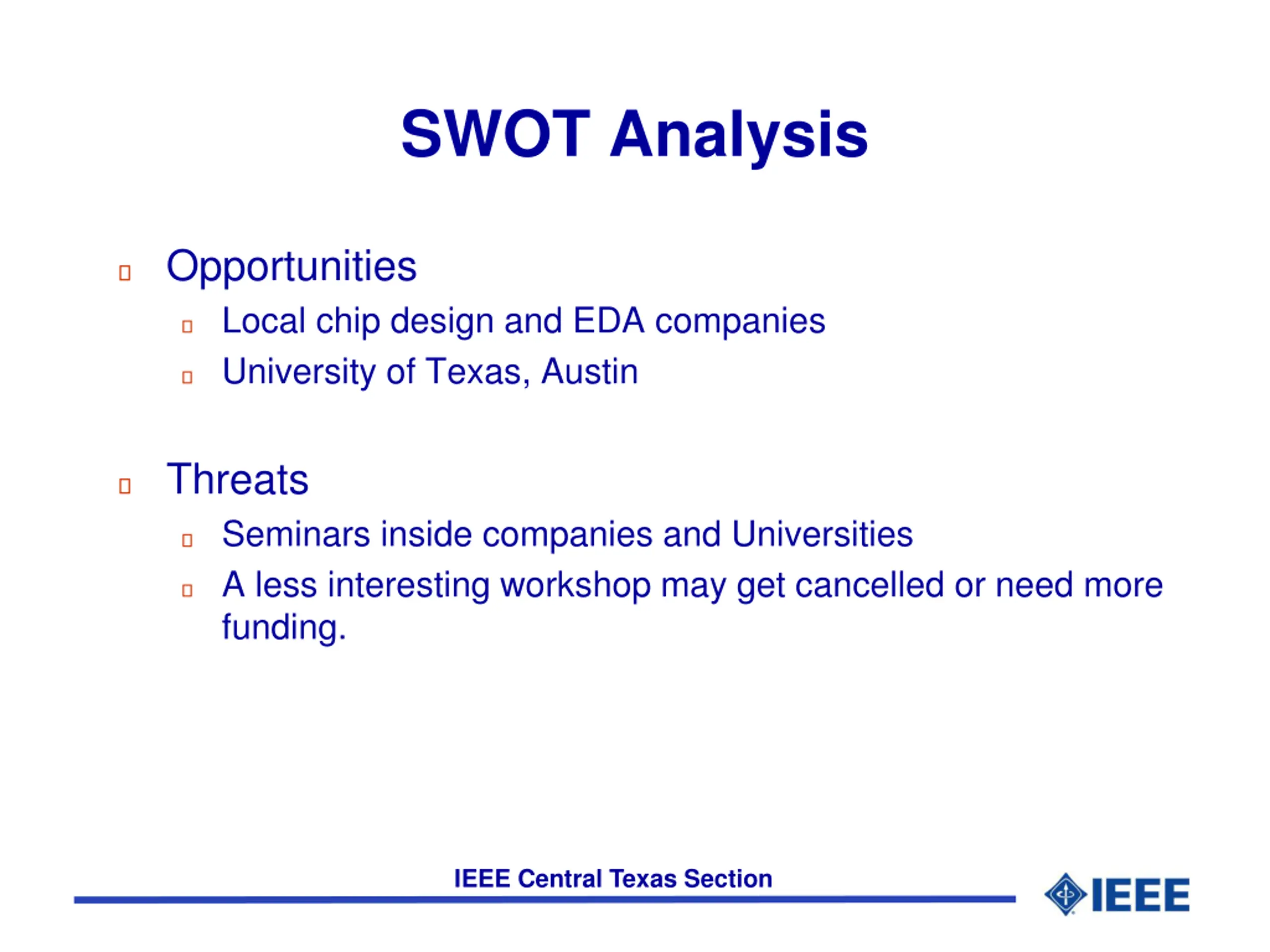 SWOT Analysis Opportunities Local chip design and EDA companies University of Texas, Austin Threats Seminars inside companies and Universities A less interesting workshop may get cancelled or need more funding. IEEE Central Texas Section