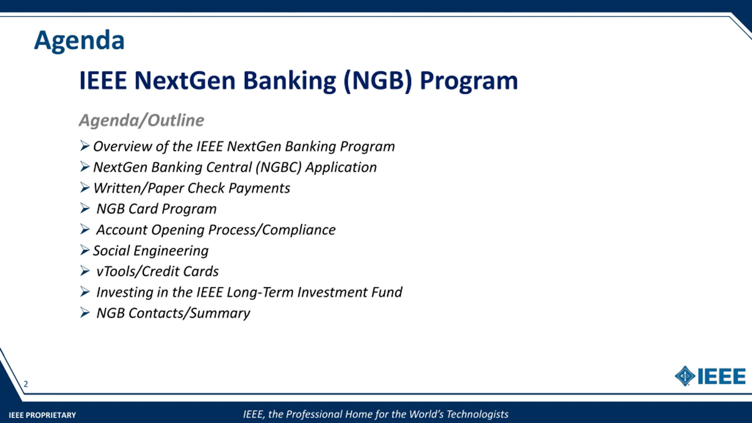Agenda IEEE NextGen Banking (NGB) Program Agenda/Outline Overview of the IEEE NextGen Banking Program NextGen Banking Central (NGBC) Application Written/Paper Check Payments NGB Card Program Account Opening Process/Compliance Social Engineering vTools/Credit Cards Investing in the IEEE Long-Term Investment Fund NGB Contacts/Summary 2 IEEE, the Professional Home for the World s Technologists IEEE PROPRIETARY