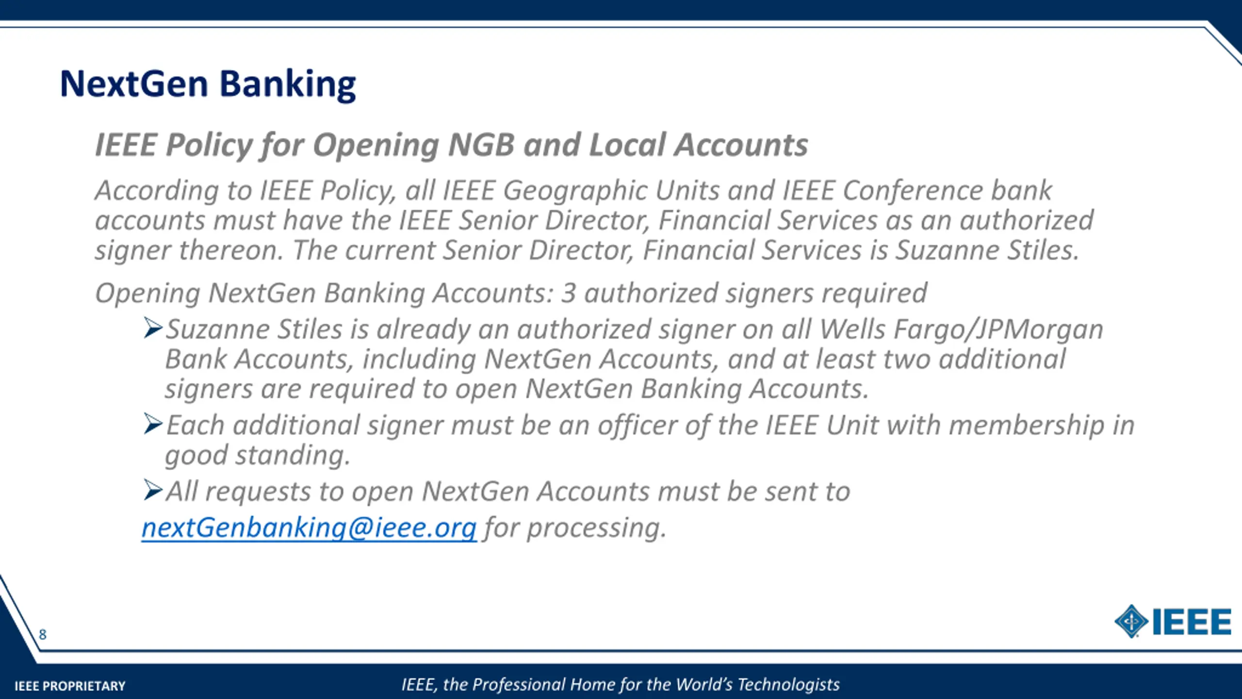 NextGen Banking IEEE Policy for Opening NGB and Local Accounts According to IEEE Policy, all IEEE Geographic Units and IEEE Conference bank accounts must have the IEEE Senior Director, Financial Services as an authorized signer thereon. The current Senior Director, Financial Services is Suzanne Stiles. Opening NextGen Banking Accounts: 3 authorized signers required Suzanne Stiles is already an authorized signer on all Wells Fargo/JPMorgan Bank Accounts, including NextGen Accounts, and at least two additional signers are required to open NextGen Banking Accounts. Each additional signer must be an officer of the IEEE Unit with membership in good standing. All requests to open NextGen Accounts must be sent to nextGenbanking@ieee.org for processing. 8 IEEE, the Professional Home for the World s Technologists IEEE PROPRIETARY
