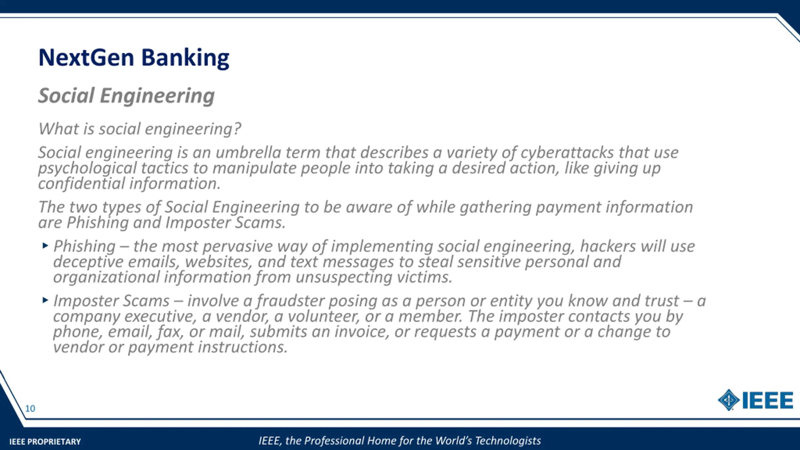 NextGen Banking Social Engineering What is social engineering? Social engineering is an umbrella term that describes a variety of cyberattacks that use psychological tactics to manipulate people into taking a desired action, like giving up confidential information. The two types of Social Engineering to be aware of while gathering payment information are Phishing and Imposter Scams. Phishing the most pervasive way of implementing social engineering, hackers will use deceptive emails, websites, and text messages to steal sensitive personal and organizational information from unsuspecting victims. Imposter Scams involve a fraudster posing as a person or entity you know and trust a company executive, a vendor, a volunteer, or a member. The imposter contacts you by phone, email, fax, or mail, submits an invoice, or requests a payment or a change to vendor or payment instructions. 10 IEEE, the Professional Home for the World s Technologists IEEE PROPRIETARY