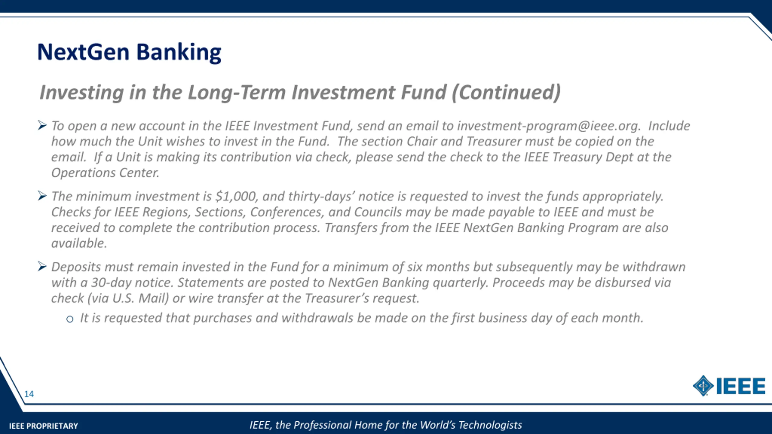 NextGen Banking Investing in the Long-Term Investment Fund (Continued) To open a new account in the IEEE Investment Fund, send an email to investment-program@ieee.org. Include how much the Unit wishes to invest in the Fund. The section Chair and Treasurer must be copied on the email. If a Unit is making its contribution via check, please send the check to the IEEE Treasury Dept at the Operations Center. The minimum investment is $1,000, and thirty-days notice is requested to invest the funds appropriately. Checks for IEEE Regions, Sections, Conferences, and Councils may be made payable to IEEE and must be received to complete the contribution process. Transfers from the IEEE NextGen Banking Program are also available. Deposits must remain invested in the Fund for a minimum of six months but subsequently may be withdrawn with a 30-day notice. Statements are posted to NextGen Banking quarterly. Proceeds may be disbursed via check (via U.S. Mail) or wire transfer at the Treasurer s request. o It is requested that purchases and withdrawals be made on the first business day of each month. 14 IEEE, the Professional Home for the World s Technologists IEEE PROPRIETARY