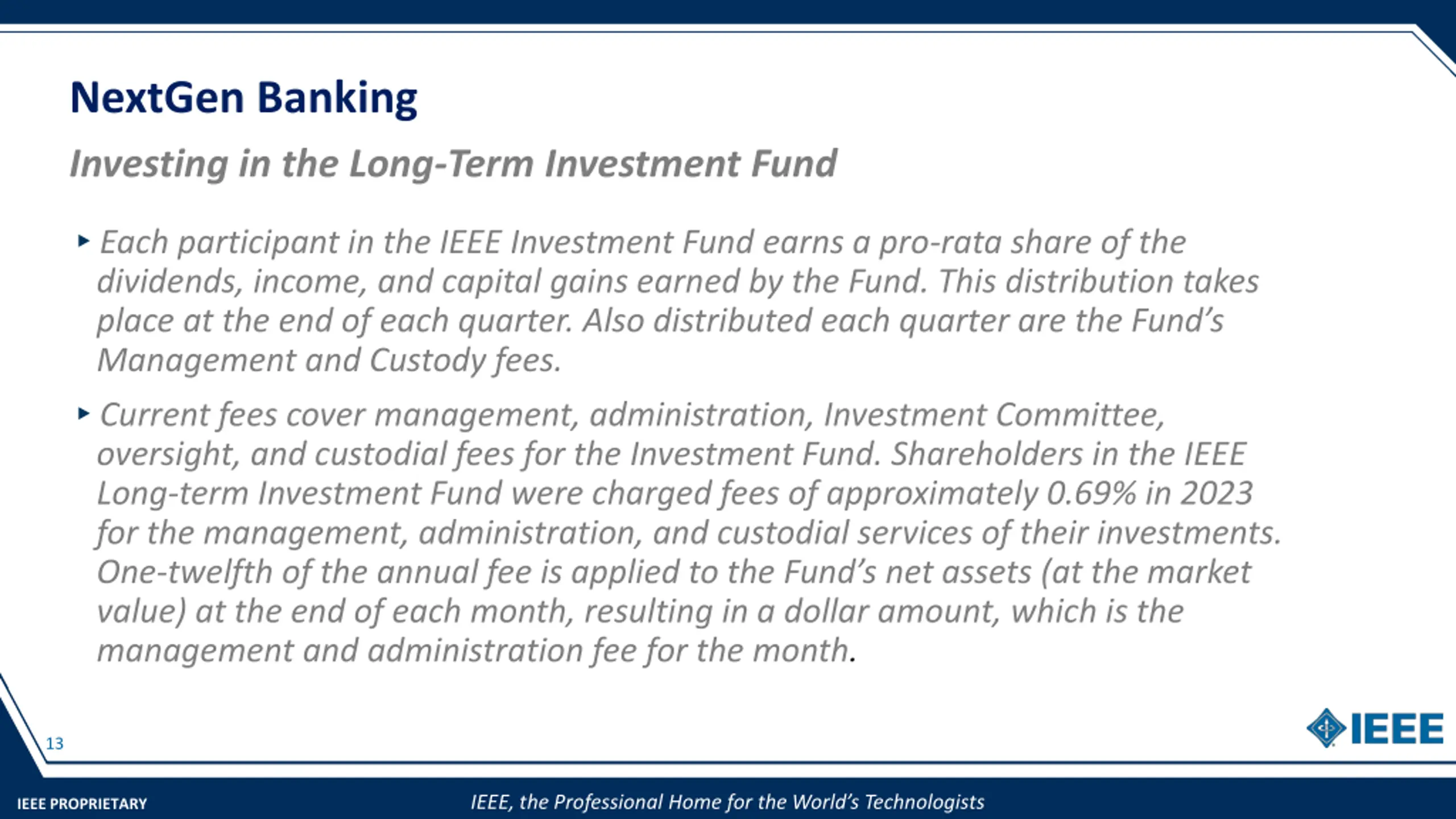 NextGen Banking Investing in the Long-Term Investment Fund Each participant in the IEEE Investment Fund earns a pro-rata share of the dividends, income, and capital gains earned by the Fund. This distribution takes place at the end of each quarter. Also distributed each quarter are the Fund s Management and Custody fees. Current fees cover management, administration, Investment Committee, oversight, and custodial fees for the Investment Fund. Shareholders in the IEEE Long-term Investment Fund were charged fees of approximately 0.69% in 2023 for the management, administration, and custodial services of their investments. One-twelfth of the annual fee is applied to the Fund s net assets (at the market value) at the end of each month, resulting in a dollar amount, which is the management and administration fee for the month. 13 IEEE, the Professional Home for the World s Technologists IEEE PROPRIETARY