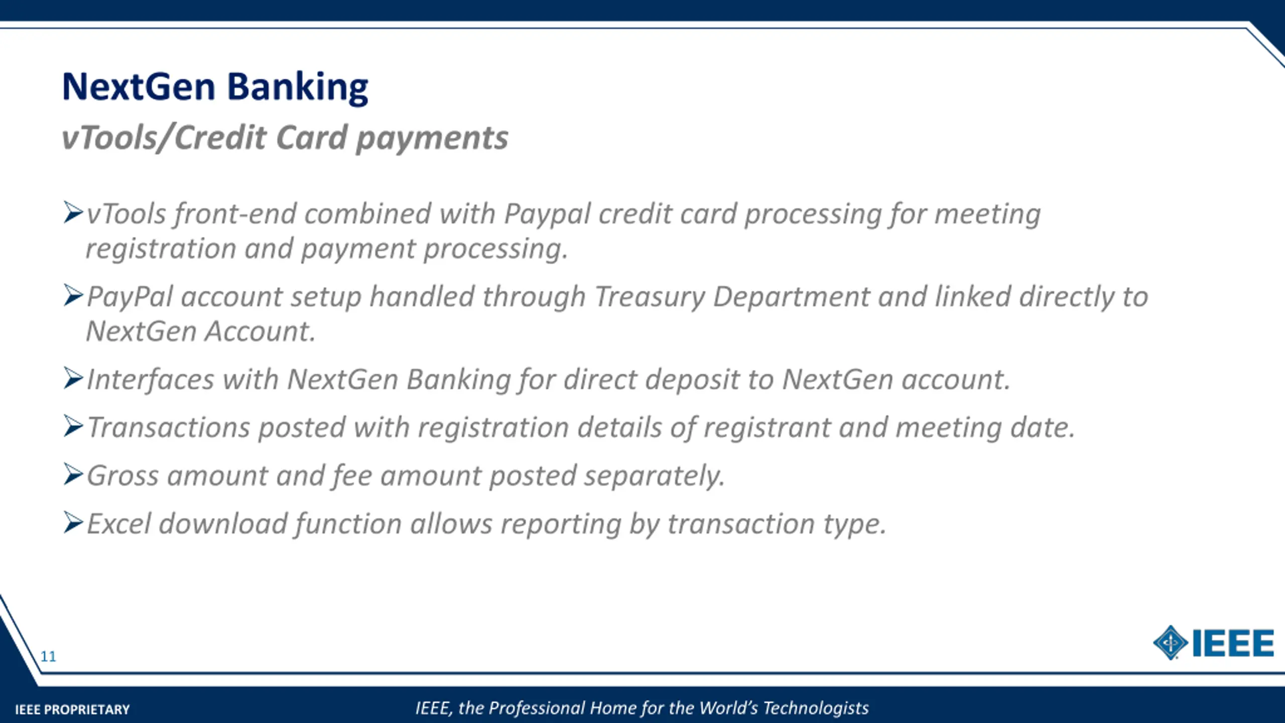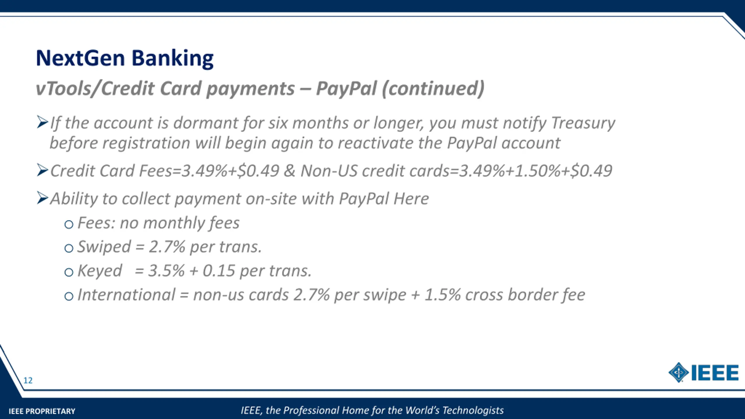 NextGen Banking vTools/Credit Card payments vTools front-end combined with Paypal credit card processing for meeting registration and payment processing. PayPal account setup handled through Treasury Department and linked directly to NextGen Account. Interfaces with NextGen Banking for direct deposit to NextGen account. Transactions posted with registration details of registrant and meeting date. Gross amount and fee amount posted separately. Excel download function allows reporting by transaction type. 11 IEEE, the Professional Home for the World s Technologists IEEE PROPRIETARY