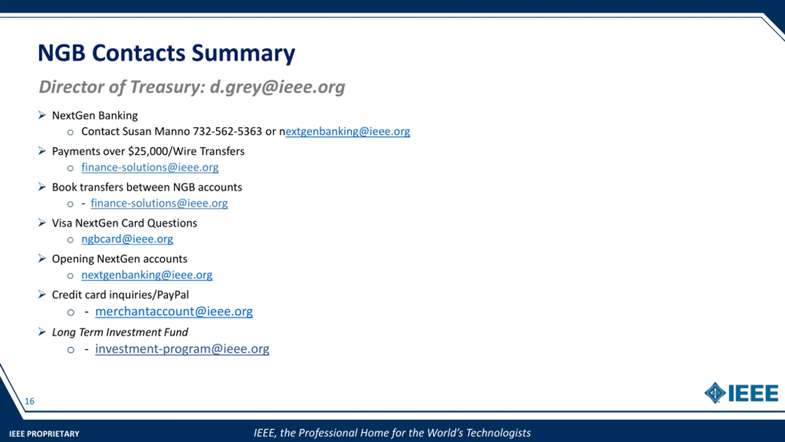 NGB Contacts Summary Director of Treasury: d.grey@ieee.org NextGen Banking o Contact Susan Manno 732-562-5363 or nextgenbanking@ieee.org Payments over $25,000/Wire Transfers o finance-solutions@ieee.org Book transfers between NGB accounts o - finance-solutions@ieee.org Visa NextGen Card Questions o ngbcard@ieee.org Opening NextGen accounts o nextgenbanking@ieee.org Credit card inquiries/PayPal o - merchantaccount@ieee.org Long Term Investment Fund o - investment-program@ieee.org 16 IEEE, the Professional Home for the World s Technologists IEEE PROPRIETARY