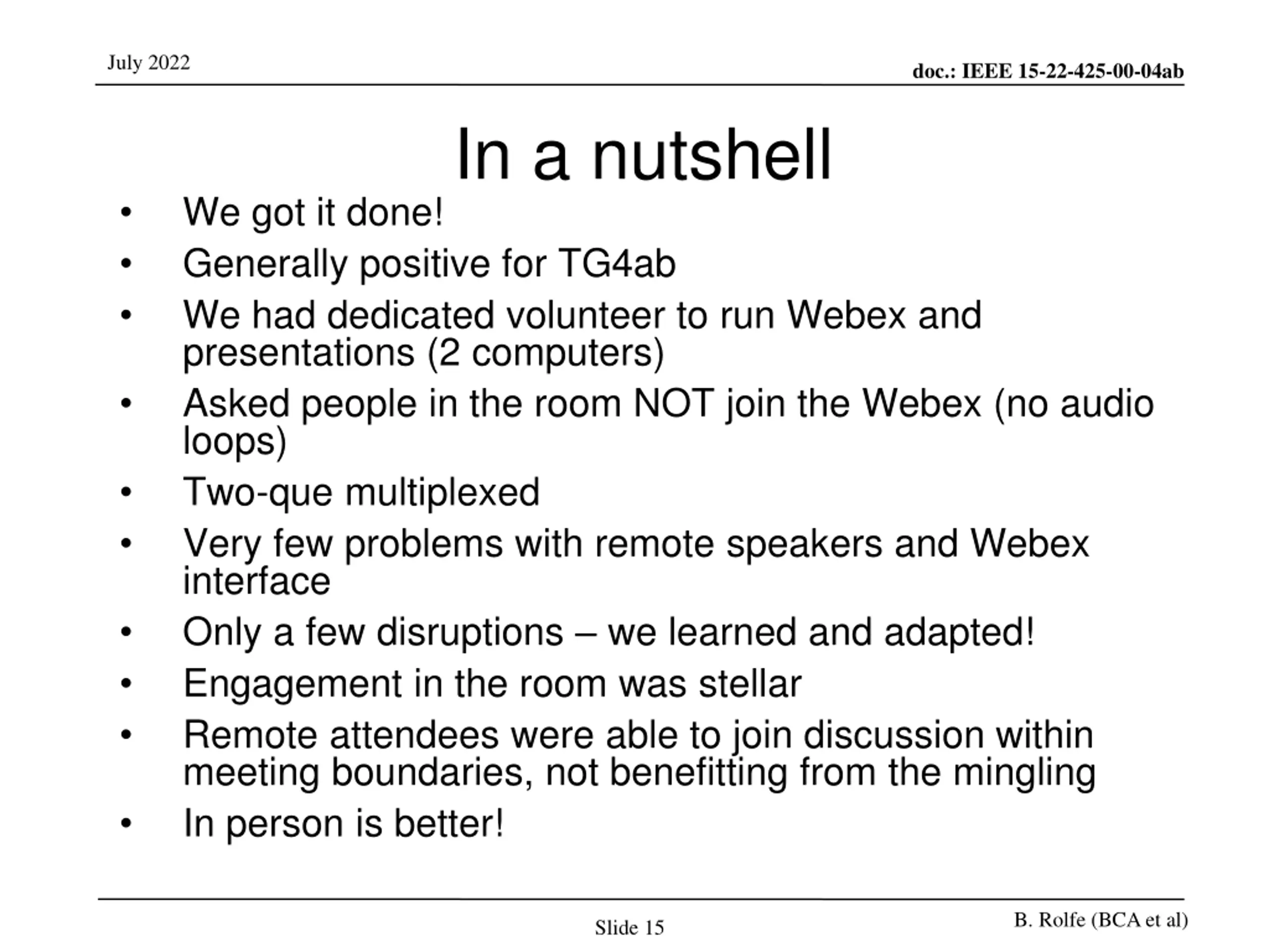 July 2022 doc.: IEEE 15-22-425-00-04ab In a nutshell We got it done! Generally positive for TG4ab We had dedicated volunteer to run Webex and presentations (2 computers) Asked people in the room NOT join the Webex (no audio loops) Two-que multiplexed Very few problems with remote speakers and Webex interface Only a few disruptions we learned and adapted! Engagement in the room was stellar Remote attendees were able to join discussion within meeting boundaries, not benefitting from the mingling In person is better! B. Rolfe (BCA et al) Slide 15