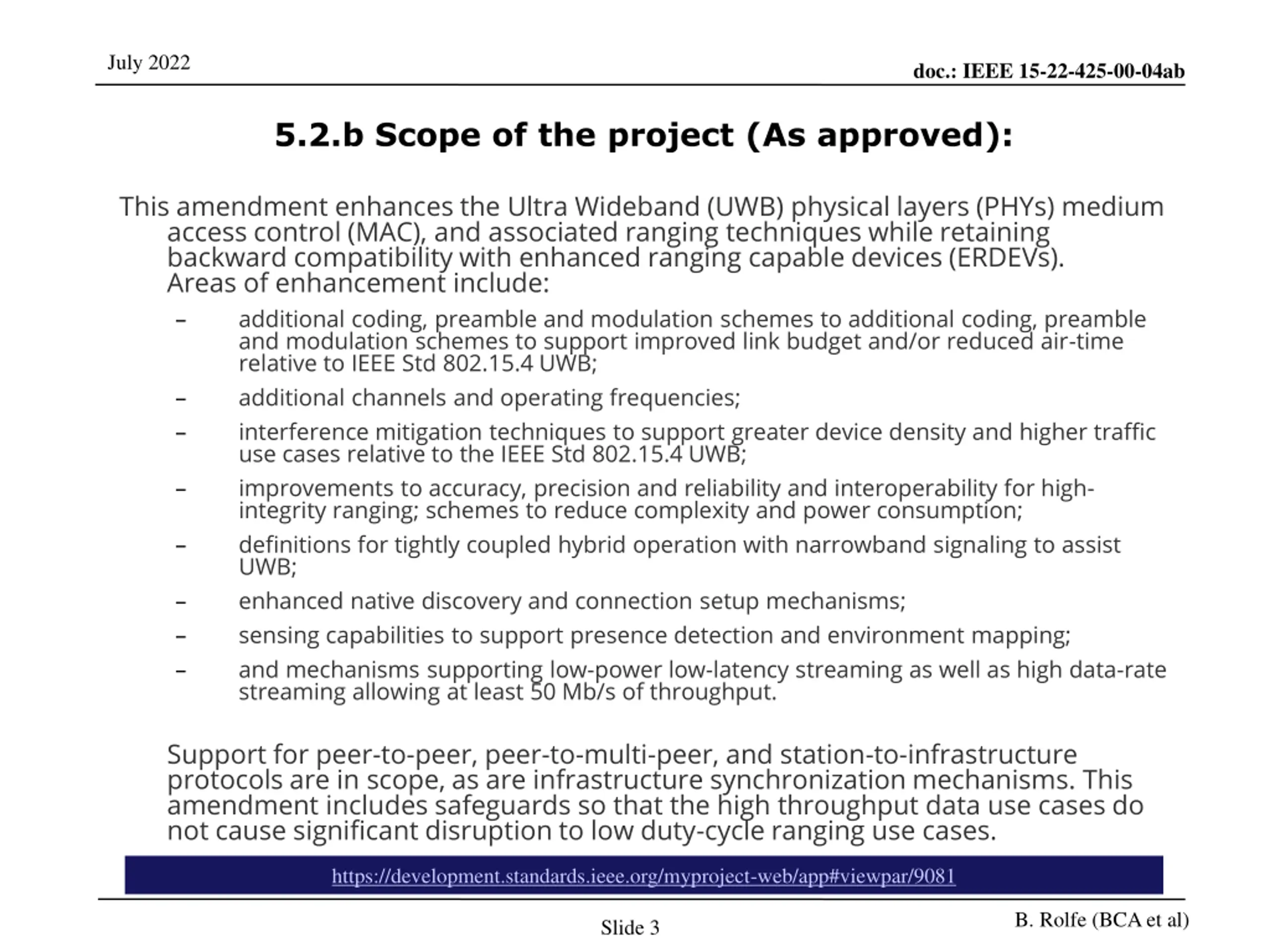 July 2022 doc.: IEEE 15-22-425-00-04ab 5.2.b Scope of the project (As approved): This amendment enhances the Ultra Wideband (UWB) physical layers (PHYs) medium access control (MAC), and associated ranging techniques while retaining backward compatibility with enhanced ranging capable devices (ERDEVs). Areas of enhancement include: additional coding, preamble and modulation schemes to additional coding, preamble and modulation schemes to support improved link budget and/or reduced air-time relative to IEEE Std 802.15.4 UWB; additional channels and operating frequencies; interference mitigation techniques to support greater device density and higher traffic use cases relative to the IEEE Std 802.15.4 UWB; improvements to accuracy, precision and reliability and interoperability for high- integrity ranging; schemes to reduce complexity and power consumption; definitions for tightly coupled hybrid operation with narrowband signaling to assist UWB; enhanced native discovery and connection setup mechanisms; sensing capabilities to support presence detection and environment mapping; and mechanisms supporting low-power low-latency streaming as well as high data-rate streaming allowing at least 50 Mb/s of throughput. Support for peer-to-peer, peer-to-multi-peer, and station-to-infrastructure protocols are in scope, as are infrastructure synchronization mechanisms. This amendment includes safeguards so that the high throughput data use cases do not cause significant disruption to low duty-cycle ranging use cases. https://development.standards.ieee.org/myproject-web/app#viewpar/9081 B. Rolfe (BCA et al) Slide 3