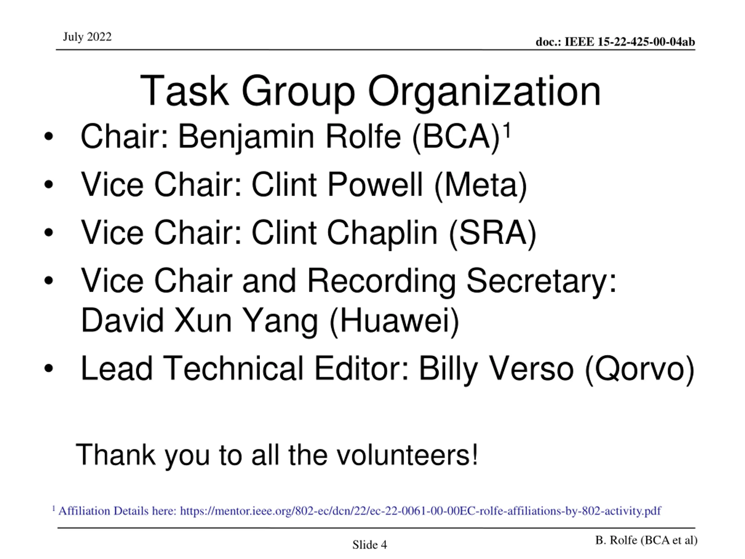 July 2022 doc.: IEEE 15-22-425-00-04ab Task Group Organization Chair: Benjamin Rolfe (BCA)1 Vice Chair: Clint Powell (Meta) Vice Chair: Clint Chaplin (SRA) Vice Chair and Recording Secretary: David Xun Yang (Huawei) Lead Technical Editor: Billy Verso (Qorvo) Thank you to all the volunteers! 1 Affiliation Details here: https://mentor.ieee.org/802-ec/dcn/22/ec-22-0061-00-00EC-rolfe-affiliations-by-802-activity.pdf B. Rolfe (BCA et al) Slide 4