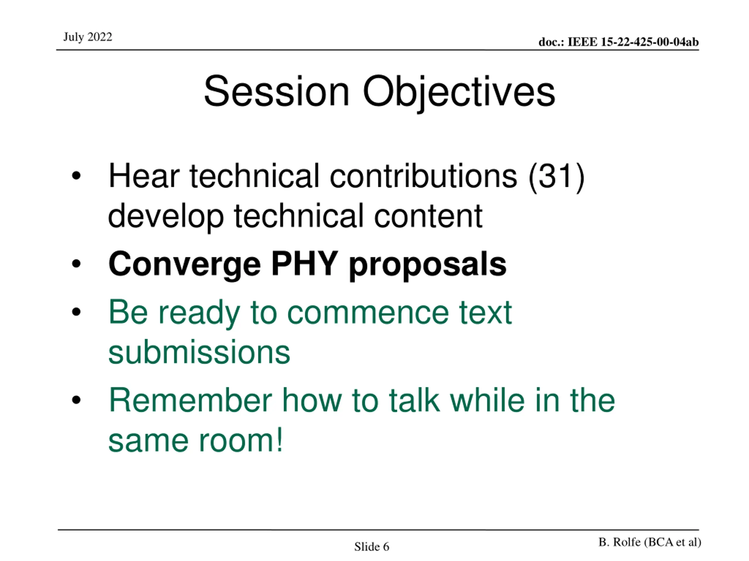 July 2022 doc.: IEEE 15-22-425-00-04ab Session Objectives Hear technical contributions (31) develop technical content Converge PHY proposals Be ready to commence text submissions Remember how to talk while in the same room! B. Rolfe (BCA et al) Slide 6