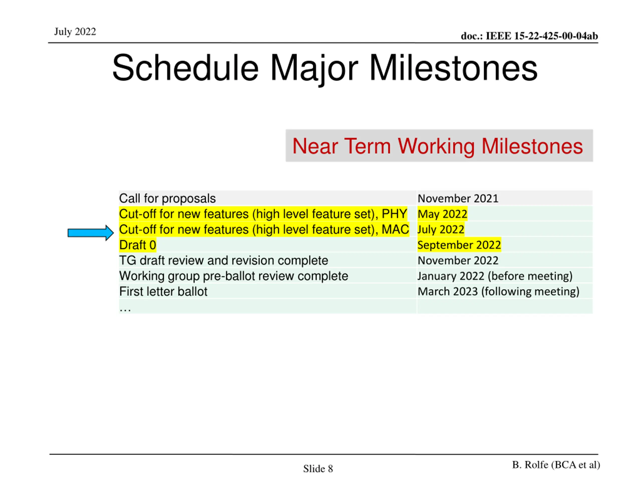 July 2022 doc.: IEEE 15-22-425-00-04ab Schedule Major Milestones Near Term Working Milestones Call for proposals Cut-off for new features (high level feature set), PHY May 2022 Cut-off for new features (high level feature set), MAC July 2022 Draft 0 TG draft review and revision complete Working group pre-ballot review complete First letter ballot November 2021 September 2022 November 2022 January 2022 (before meeting) March 2023 (following meeting) B. Rolfe (BCA et al) Slide 8