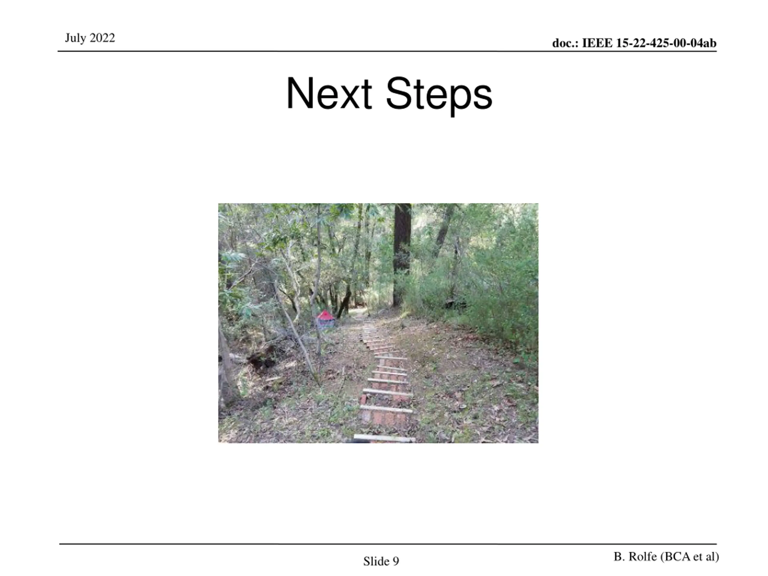 July 2022 doc.: IEEE 15-22-425-00-04ab Next Steps B. Rolfe (BCA et al) Slide 9