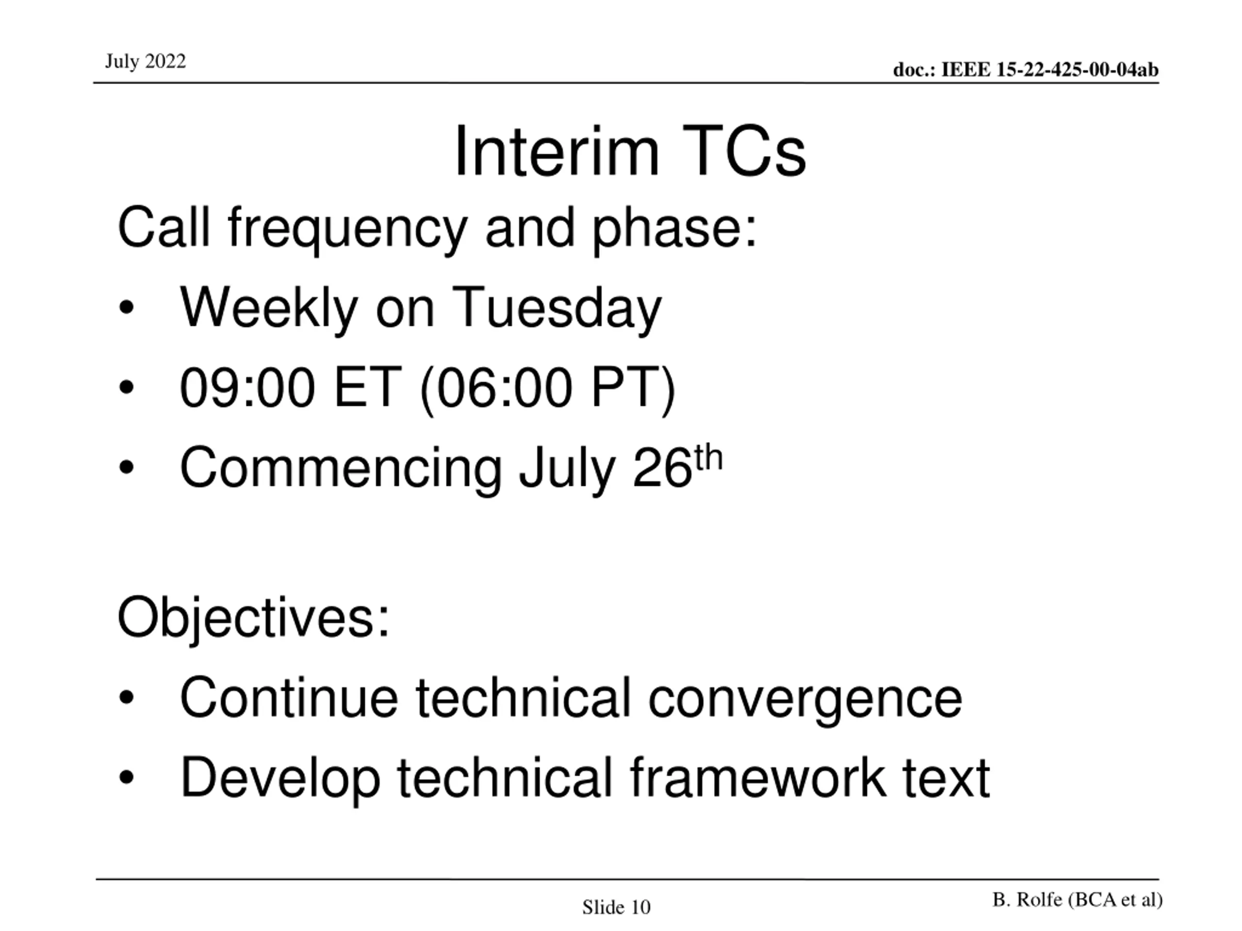 July 2022 doc.: IEEE 15-22-425-00-04ab Interim TCs Call frequency and phase: Weekly on Tuesday 09:00 ET (06:00 PT) Commencing July 26th Objectives: Continue technical convergence Develop technical framework text B. Rolfe (BCA et al) Slide 10