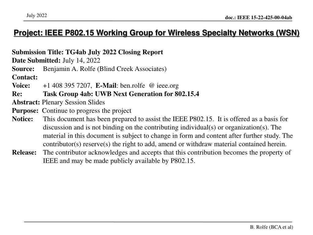 July 2022 doc.: IEEE 15-22-425-00-04ab Project: IEEE P802.15 Working Group for Wireless Specialty Networks (WSN) Submission Title: TG4ab July 2022 Closing Report Date Submitted: July 14, 2022 Source: Benjamin A. Rolfe (Blind Creek Associates) Contact: Voice: +1 408 395 7207, E-Mail: ben.rolfe @ ieee.org Re: Task Group 4ab: UWB Next Generation for 802.15.4 Abstract: Plenary Session Slides Purpose: Continue to progress the project Notice: This document has been prepared to assist the IEEE P802.15. It is offered as a basis for discussion and is not binding on the contributing individual(s) or organization(s). The material in this document is subject to change in form and content after further study. The contributor(s) reserve(s) the right to add, amend or withdraw material contained herein. Release: The contributor acknowledges and accepts that this contribution becomes the property of IEEE and may be made publicly available by P802.15. B. Rolfe (BCA et al)