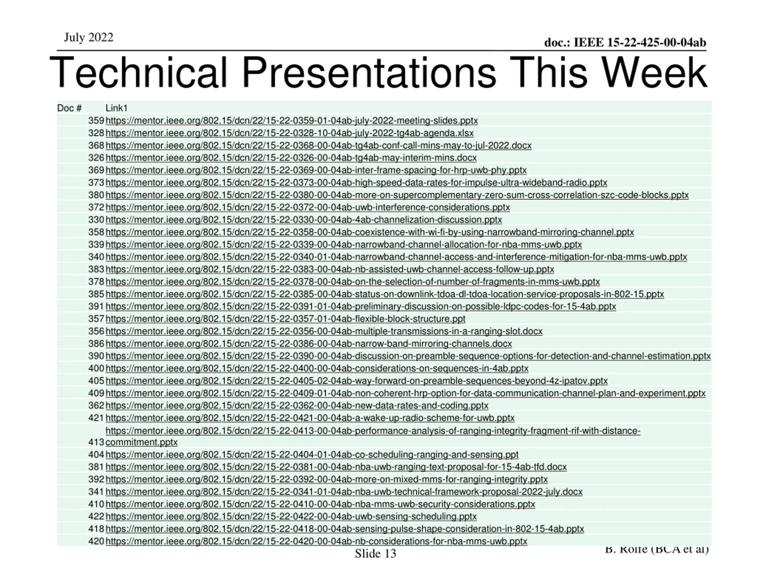 July 2022 Technical Presentations This Week doc.: IEEE 15-22-425-00-04ab Doc # Link1 359https://mentor.ieee.org/802.15/dcn/22/15-22-0359-01-04ab-july-2022-meeting-slides.pptx 328https://mentor.ieee.org/802.15/dcn/22/15-22-0328-10-04ab-july-2022-tg4ab-agenda.xlsx 368https://mentor.ieee.org/802.15/dcn/22/15-22-0368-00-04ab-tg4ab-conf-call-mins-may-to-jul-2022.docx 326https://mentor.ieee.org/802.15/dcn/22/15-22-0326-00-04ab-tg4ab-may-interim-mins.docx 369https://mentor.ieee.org/802.15/dcn/22/15-22-0369-00-04ab-inter-frame-spacing-for-hrp-uwb-phy.pptx 373https://mentor.ieee.org/802.15/dcn/22/15-22-0373-00-04ab-high-speed-data-rates-for-impulse-ultra-wideband-radio.pptx 380https://mentor.ieee.org/802.15/dcn/22/15-22-0380-00-04ab-more-on-supercomplementary-zero-sum-cross-correlation-szc-code-blocks.pptx 372https://mentor.ieee.org/802.15/dcn/22/15-22-0372-00-04ab-uwb-interference-considerations.pptx 330https://mentor.ieee.org/802.15/dcn/22/15-22-0330-00-04ab-4ab-channelization-discussion.pptx 358https://mentor.ieee.org/802.15/dcn/22/15-22-0358-00-04ab-coexistence-with-wi-fi-by-using-narrowband-mirroring-channel.pptx 339https://mentor.ieee.org/802.15/dcn/22/15-22-0339-00-04ab-narrowband-channel-allocation-for-nba-mms-uwb.pptx 340https://mentor.ieee.org/802.15/dcn/22/15-22-0340-01-04ab-narrowband-channel-access-and-interference-mitigation-for-nba-mms-uwb.pptx 383https://mentor.ieee.org/802.15/dcn/22/15-22-0383-00-04ab-nb-assisted-uwb-channel-access-follow-up.pptx 378https://mentor.ieee.org/802.15/dcn/22/15-22-0378-00-04ab-on-the-selection-of-number-of-fragments-in-mms-uwb.pptx 385https://mentor.ieee.org/802.15/dcn/22/15-22-0385-00-04ab-status-on-downlink-tdoa-dl-tdoa-location-service-proposals-in-802-15.pptx 391https://mentor.ieee.org/802.15/dcn/22/15-22-0391-01-04ab-preliminary-discussion-on-possible-ldpc-codes-for-15-4ab.pptx 357https://mentor.ieee.org/802.15/dcn/22/15-22-0357-01-04ab-flexible-block-structure.ppt 356https://mentor.ieee.org/802.15/dcn/22/15-22-0356-00-04ab-multiple-transmissions-in-a-ranging-slot.docx 386https://mentor.ieee.org/802.15/dcn/22/15-22-0386-00-04ab-narrow-band-mirroring-channels.docx 390https://mentor.ieee.org/802.15/dcn/22/15-22-0390-00-04ab-discussion-on-preamble-sequence-options-for-detection-and-channel-estimation.pptx 400https://mentor.ieee.org/802.15/dcn/22/15-22-0400-00-04ab-considerations-on-sequences-in-4ab.pptx 405https://mentor.ieee.org/802.15/dcn/22/15-22-0405-02-04ab-way-forward-on-preamble-sequences-beyond-4z-ipatov.pptx 409https://mentor.ieee.org/802.15/dcn/22/15-22-0409-01-04ab-non-coherent-hrp-option-for-data-communication-channel-plan-and-experiment.pptx 362https://mentor.ieee.org/802.15/dcn/22/15-22-0362-00-04ab-new-data-rates-and-coding.pptx 421https://mentor.ieee.org/802.15/dcn/22/15-22-0421-00-04ab-a-wake-up-radio-scheme-for-uwb.pptx https://mentor.ieee.org/802.15/dcn/22/15-22-0413-00-04ab-performance-analysis-of-ranging-integrity-fragment-rif-with-distance- commitment.pptx 404https://mentor.ieee.org/802.15/dcn/22/15-22-0404-01-04ab-co-scheduling-ranging-and-sensing.ppt 381https://mentor.ieee.org/802.15/dcn/22/15-22-0381-00-04ab-nba-uwb-ranging-text-proposal-for-15-4ab-tfd.docx 392https://mentor.ieee.org/802.15/dcn/22/15-22-0392-00-04ab-more-on-mixed-mms-for-ranging-integrity.pptx 341https://mentor.ieee.org/802.15/dcn/22/15-22-0341-01-04ab-nba-uwb-technical-framework-proposal-2022-july.docx 410https://mentor.ieee.org/802.15/dcn/22/15-22-0410-00-04ab-nba-mms-uwb-security-considerations.pptx 422https://mentor.ieee.org/802.15/dcn/22/15-22-0422-00-04ab-uwb-sensing-scheduling.pptx 418https://mentor.ieee.org/802.15/dcn/22/15-22-0418-00-04ab-sensing-pulse-shape-consideration-in-802-15-4ab.pptx 420https://mentor.ieee.org/802.15/dcn/22/15-22-0420-00-04ab-nb-considerations-for-nba-mms-uwb.pptx 413 B. Rolfe (BCA et al) Slide 13