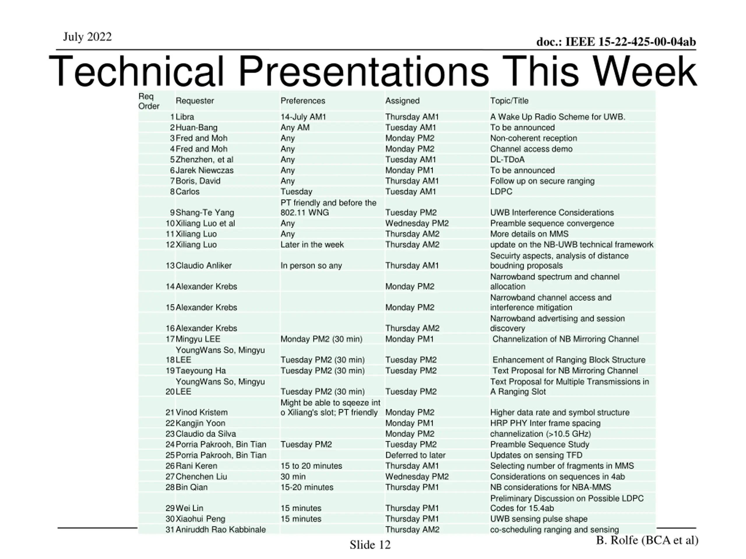 July 2022 Technical Presentations This Week Req Order 1Libra 14-July AM1 2Huan-Bang Any AM 3Fred and Moh Any 4Fred and Moh Any 5Zhenzhen, et al Any 6Jarek Niewczas Any 7Boris, David Any 8Carlos Tuesday PT friendly and before the 802.11 WNG 10Xiliang Luo et al Any 11Xiliang Luo Any 12Xiliang Luo Later in the week doc.: IEEE 15-22-425-00-04ab Requester Preferences Assigned Topic/Title Thursday AM1 Tuesday AM1 Monday PM2 Monday PM2 Tuesday AM1 Monday PM1 Thursday AM1 Tuesday AM1 A Wake Up Radio Scheme for UWB. To be announced Non-coherent reception Channel access demo DL-TDoA To be announced Follow up on secure ranging LDPC 9Shang-Te Yang Tuesday PM2 Wednesday PM2 Thursday AM2 Thursday AM2 UWB Interference Considerations Preamble sequence convergence More details on MMS update on the NB-UWB technical framework Secuirty aspects, analysis of distance boudning proposals Narrowband spectrum and channel allocation Narrowband channel access and interference mitigation Narrowband advertising and session discovery Channelization of NB Mirroring Channel 13Claudio Anliker In person so any Thursday AM1 14Alexander Krebs Monday PM2 15Alexander Krebs Monday PM2 16Alexander Krebs 17Mingyu LEE YoungWans So, Mingyu LEE 19Taeyoung Ha YoungWans So, Mingyu LEE Thursday AM2 Monday PM1 Monday PM2 (30 min) 18 Tuesday PM2 (30 min) Tuesday PM2 (30 min) Tuesday PM2 Tuesday PM2 Enhancement of Ranging Block Structure Text Proposal for NB Mirroring Channel Text Proposal for Multiple Transmissions in A Ranging Slot 20 Tuesday PM2 (30 min) Might be able to sqeeze int o Xiliang's slot; PT friendly Monday PM2 Tuesday PM2 21Vinod Kristem 22Kangjin Yoon 23Claudio da Silva 24Porria Pakrooh, Bin Tian 25Porria Pakrooh, Bin Tian 26Rani Keren 27Chenchen Liu 28Bin Qian Higher data rate and symbol structure HRP PHY Inter frame spacing channelization (>10.5 GHz) Preamble Sequence Study Updates on sensing TFD Selecting number of fragments in MMS Considerations on sequences in 4ab NB considerations for NBA-MMS Preliminary Discussion on Possible LDPC Codes for 15.4ab UWB sensing pulse shape co-scheduling ranging and sensing Monday PM1 Monday PM2 Tuesday PM2 Deferred to later Thursday AM1 Wednesday PM2 Thursday PM1 Tuesday PM2 15 to 20 minutes 30 min 15-20 minutes 29Wei Lin 30Xiaohui Peng 31Aniruddh Rao Kabbinale 15 minutes 15 minutes Thursday PM1 Thursday PM1 Thursday AM2 B. Rolfe (BCA et al) Slide 12