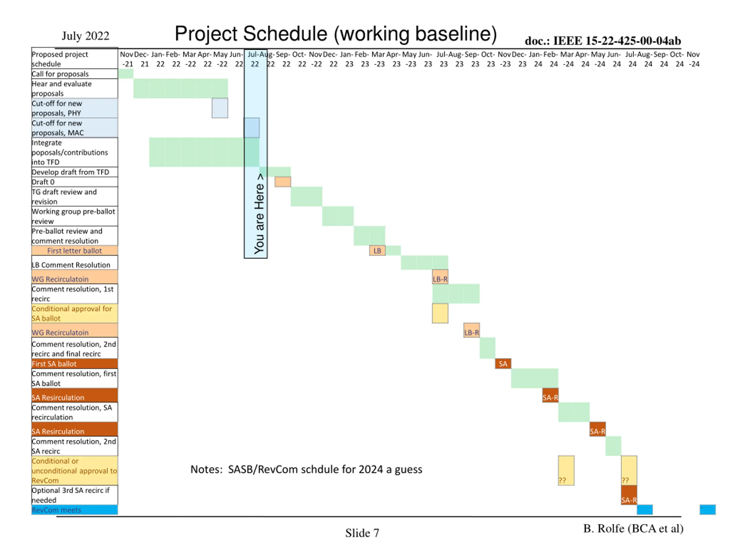 Project Schedule (working baseline) July 2022 doc.: IEEE 15-22-425-00-04ab Dec- 23 24 24 -24 24 -24 Proposed project schedule Call for proposals Hear and evaluate proposals Cut-off for new proposals, PHY Cut-off for new proposals, MAC Integrate poposals/contributions into TFD Develop draft from TFD Draft 0 TG draft review and revision Working group pre-ballot review Pre-ballot review and comment resolution First letter ballot Nov -21 Dec- 21 Jan- 22 Feb- 22 Mar -22 Apr- 22 May -22 Jun- 22 Jul- 22 Aug- 22 Sep- 22 Oct- 22 Nov -22 Dec- 22 Jan- 23 Feb- 23 Mar -23 Apr- 23 May -23 Jun- 23 Jul- 23 Aug- 23 Sep- 23 Oct- 23 Nov -23 Jan- Feb- Mar Apr- May Jun- 24 Jul- 24 Aug- 24 Sep- 24 Oct- 24 Nov -24 You are Here > LB LB Comment Resolution WG Recirculatoin Comment resolution, 1st recirc Conditional approval for SA ballot LB-R WG Recirculatoin Comment resolution, 2nd recirc and final recirc First SA ballot Comment resolution, first SA ballot LB-R SA SA Resirculation Comment resolution, SA recirculation SA-R SA Resirculation Comment resolution, 2nd SA recirc Conditional or unconditional approval to RevCom Optional 3rd SA recirc if needed RevCom meets SA-R Notes: SASB/RevCom schdule for 2024 a guess ?? ?? SA-R ` ` B. Rolfe (BCA et al) Slide 7