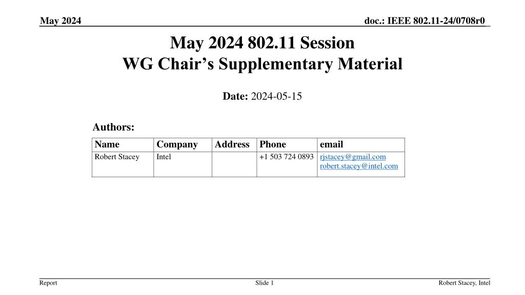 May 2024 doc.: IEEE 802.11-24/0708r0 May 2024 802.11 Session WG Chair s Supplementary Material Date: 2024-05-15 Authors: Name Robert Stacey Company Intel Address Phone email +1 503 724 0893 rjstacey@gmail.com robert.stacey@intel.com Report Slide 1 Robert Stacey, Intel