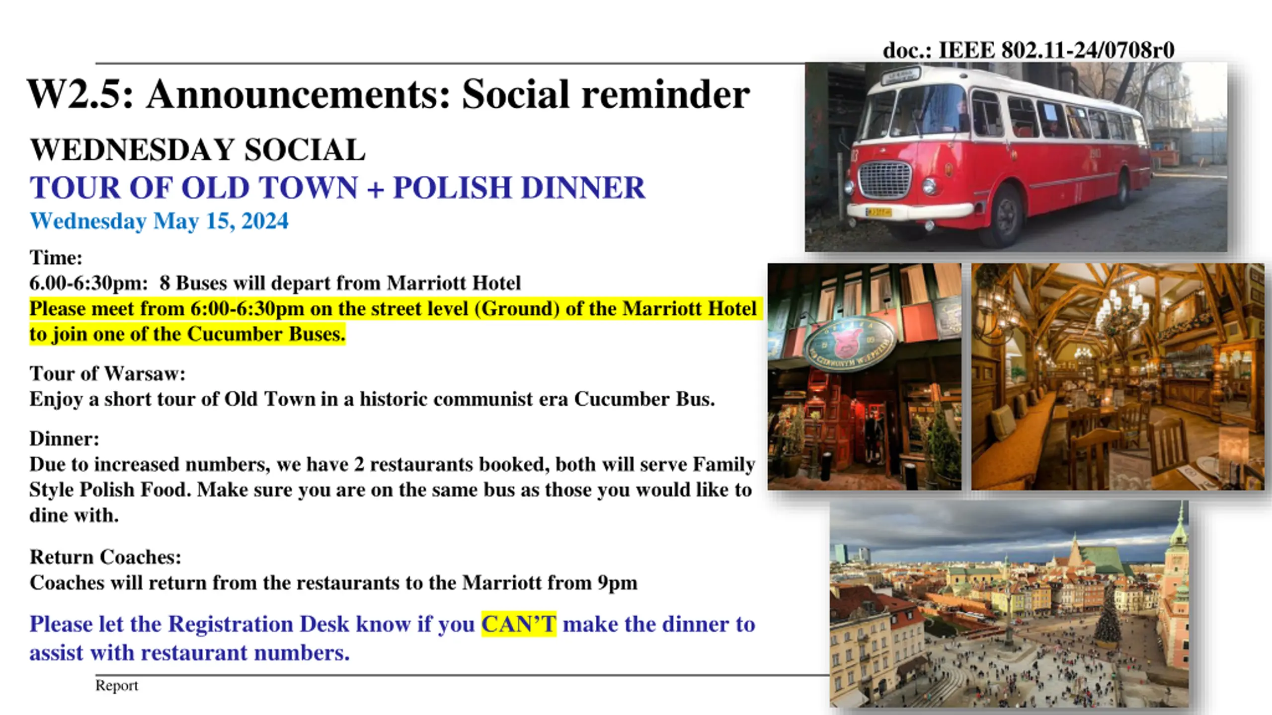 doc.: IEEE 802.11-24/0708r0 W2.5: Announcements: Social reminder WEDNESDAY SOCIAL TOUR OF OLD TOWN + POLISH DINNER Wednesday May 15, 2024 Time: 6.00-6:30pm: 8 Buses will depart from Marriott Hotel Please meet from 6:00-6:30pm on the street level (Ground) of the Marriott Hotel to join one of the Cucumber Buses. Tour of Warsaw: Enjoy a short tour of Old Town in a historic communist era Cucumber Bus. Dinner: Due to increased numbers, we have 2 restaurants booked, both will serve Family Style Polish Food. Make sure you are on the same bus as those you would like to dine with. Return Coaches: Coaches will return from the restaurants to the Marriott from 9pm Please let the Registration Desk know if you CAN T make the dinner to assist with restaurant numbers. Report